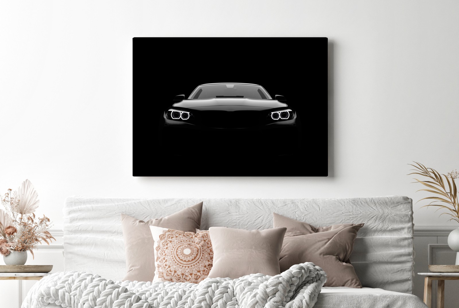 Kontrastreiche Aufnahme eines luxuriösen Sportwagens in dramatischer Silhouette, ideal für moderne Innenräume und Autoenthusiasten.