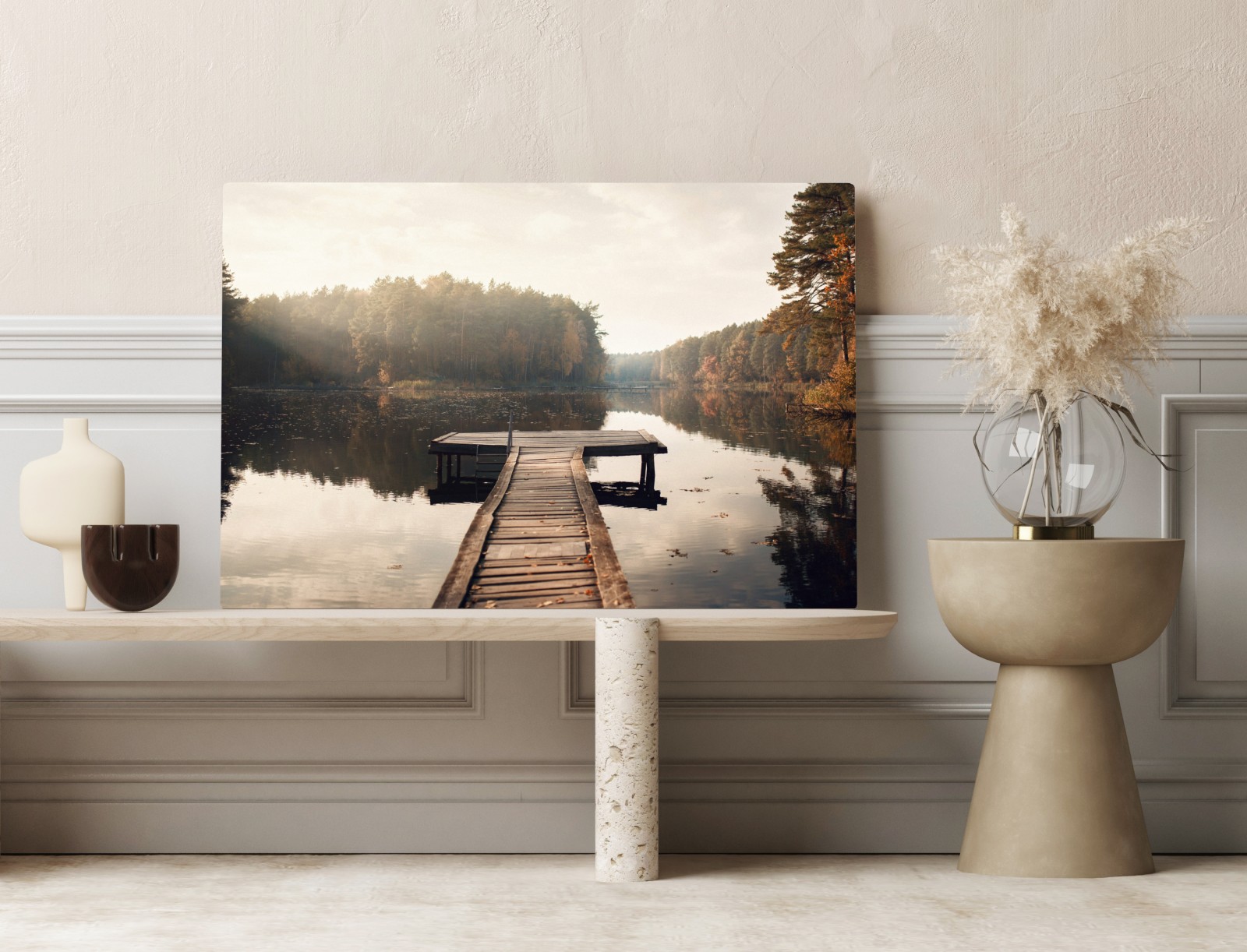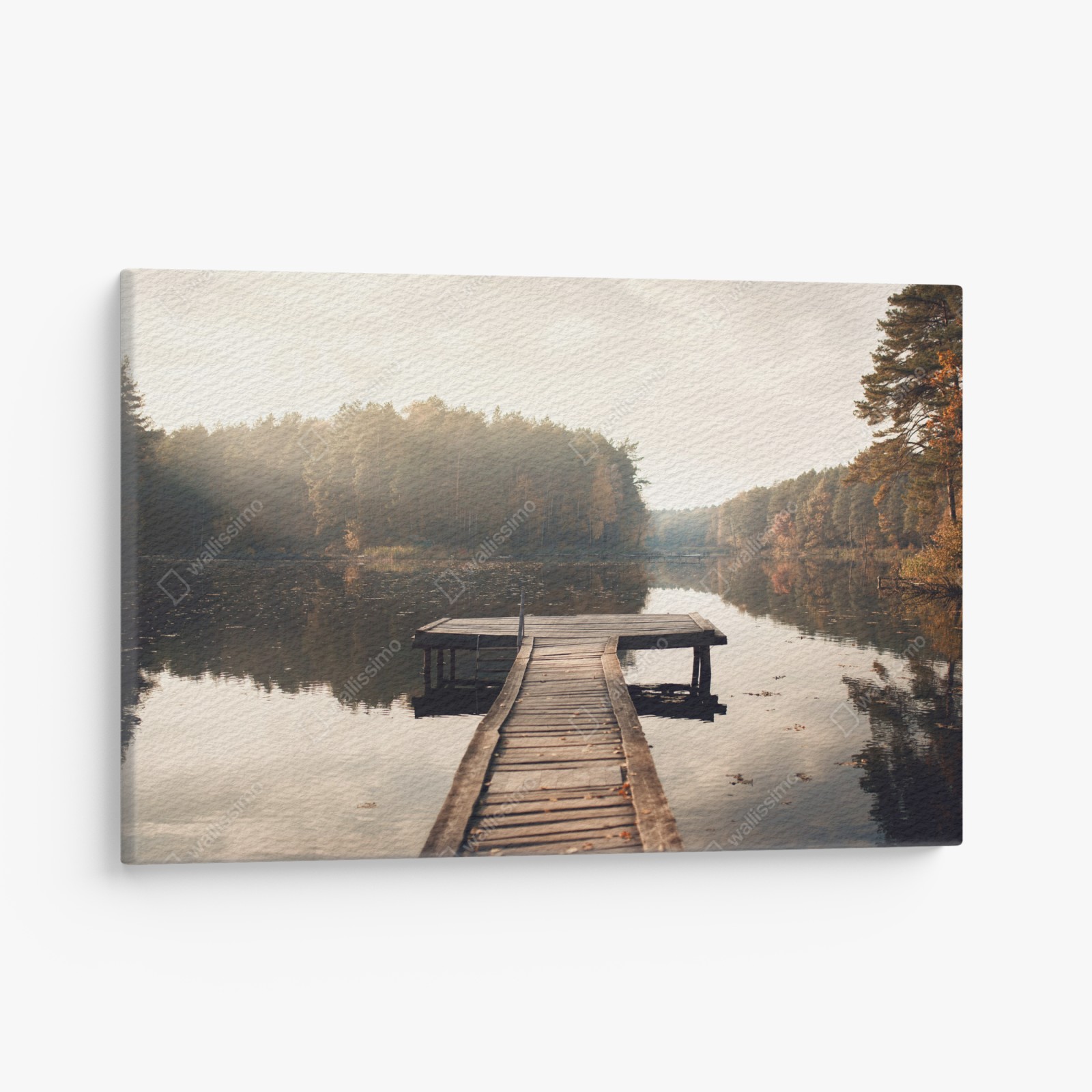 Eine ruhige herbstliche Seeszene mit verwittertem hölzernen Steg, nebligen Spiegelungen und warmen Farbtönen, die jedem Raum Gemütlichkeit verleiht.