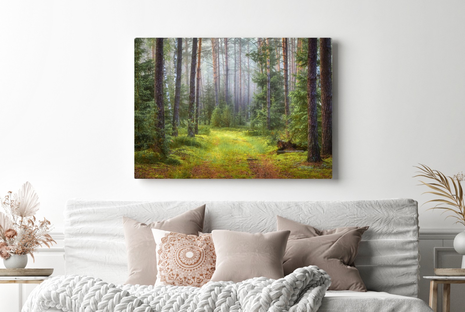 Eine ruhige, neblige Kiefernwaldszene bringt beruhigendes Grün und natürliche Tiefe in jeden Raum.