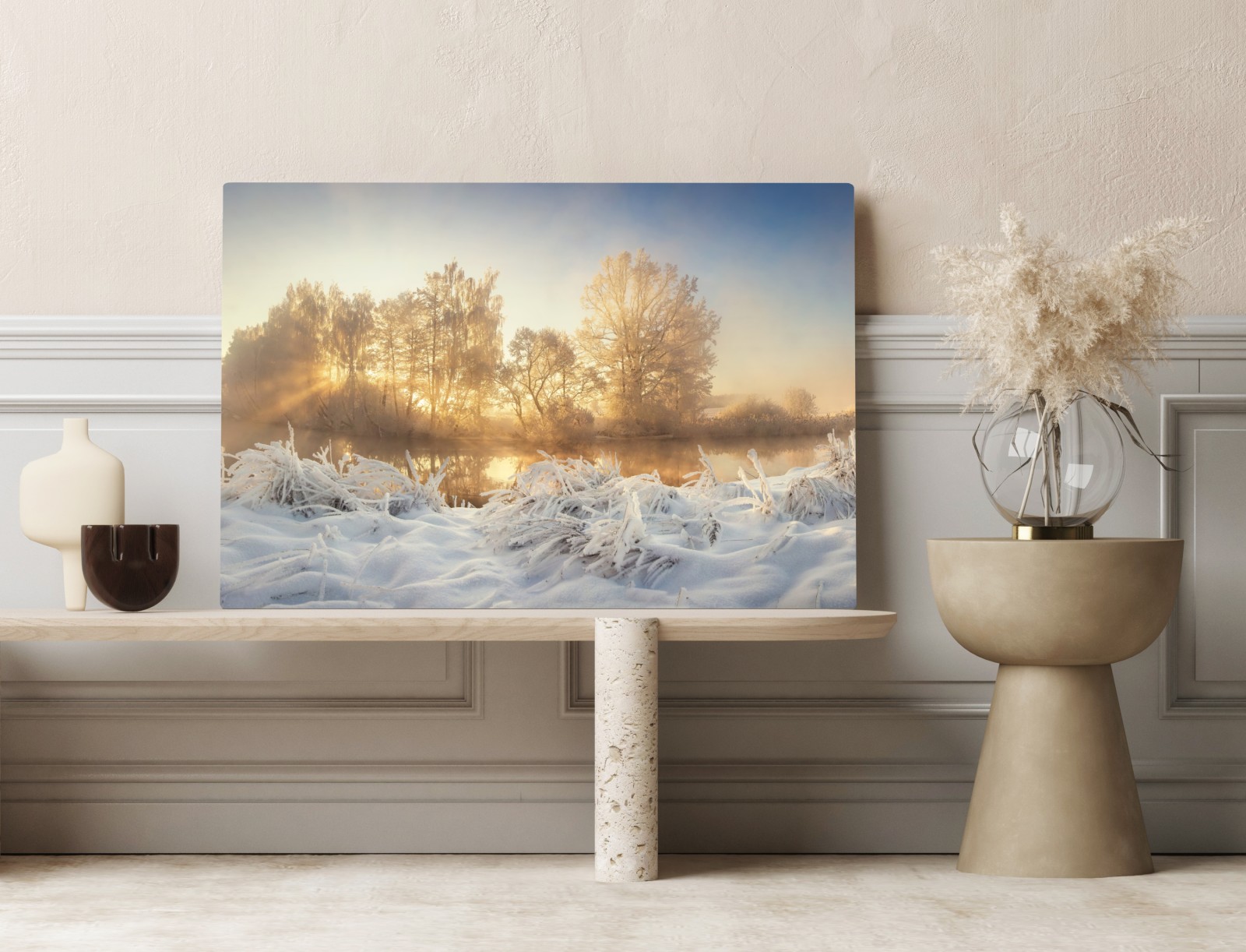 Eine ruhige Winterlandschaft im goldenen Morgenlicht mit frostigen Bäumen und einem stillen Fluss, die kalte Morgen wärmer erscheinen lassen.