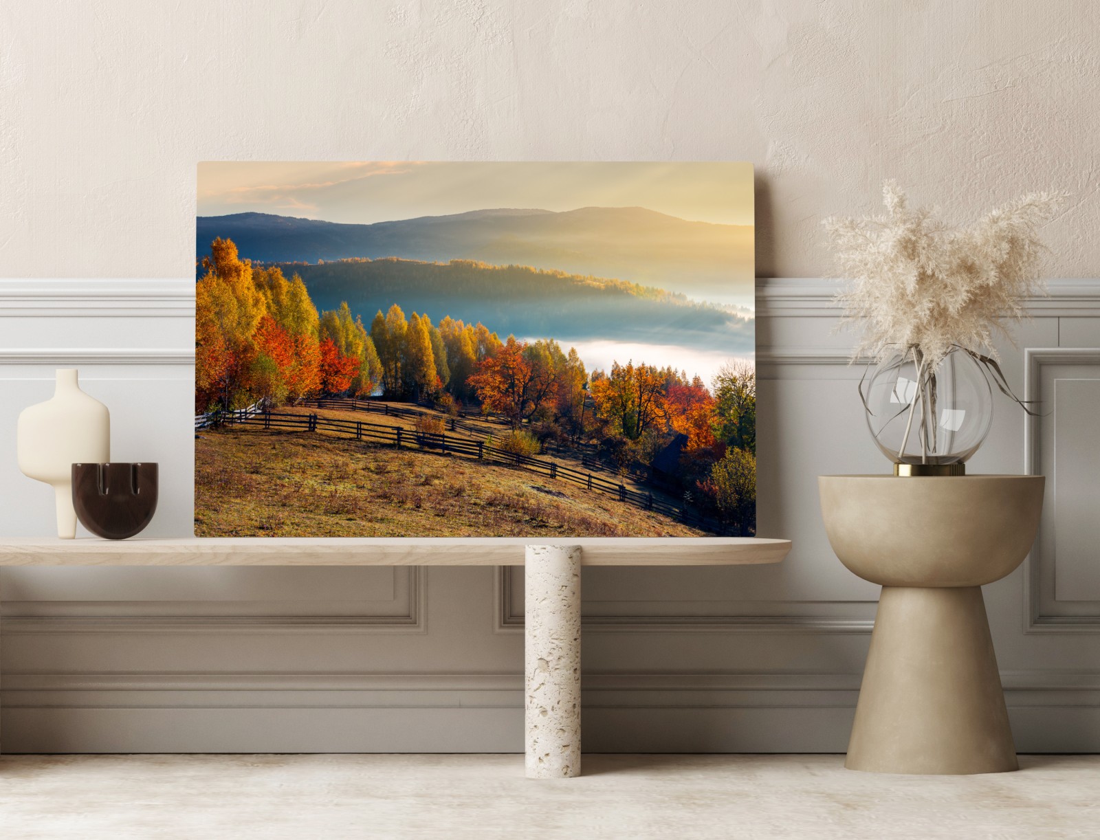 Ein warmer, nebliger herbstlicher Sonnenaufgang über sanften Hügeln und bunten Bäumen bringt rustikalen Charme und eine beruhigende Atmosphäre in jeden Raum.