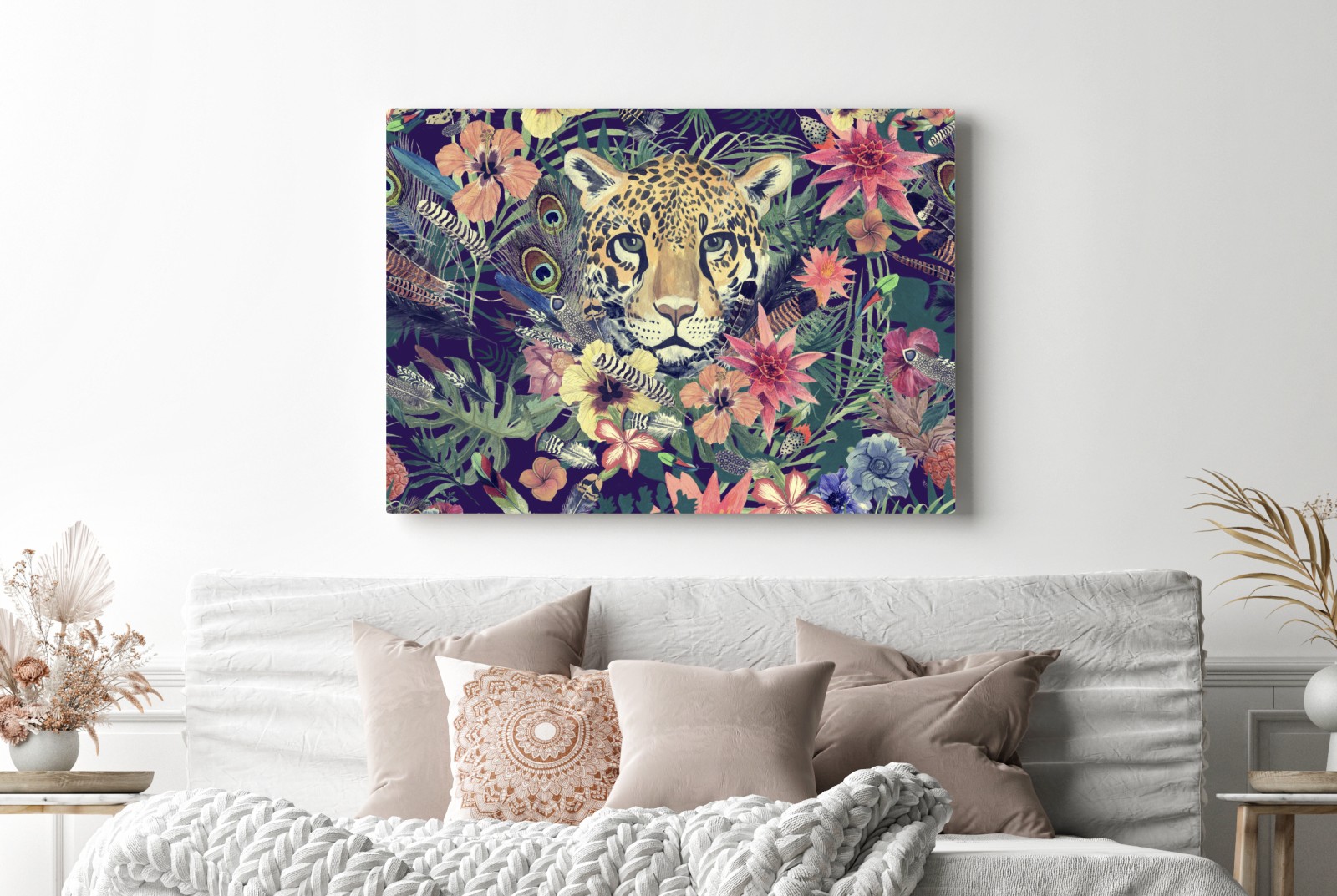 Eine vintage Aquarell-Illustration eines Leoparden umgeben von tropischen Blumen und Federn, ideal um exotische, botanische Energie in jeden Raum zu bringen.