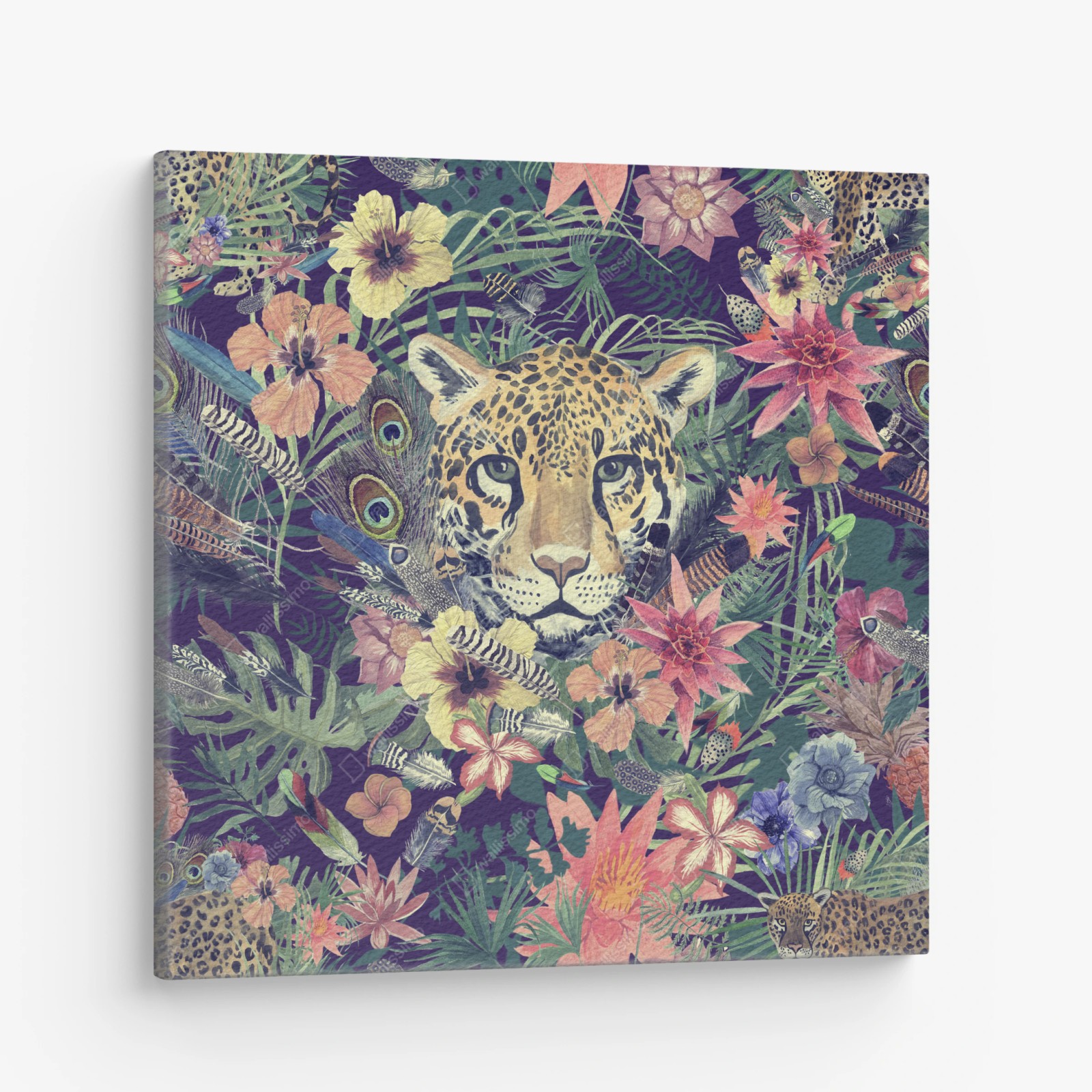 Eine vintage Aquarell-Illustration eines Leoparden umgeben von tropischen Blumen und Federn, ideal um exotische, botanische Energie in jeden Raum zu bringen.MehrWeniger