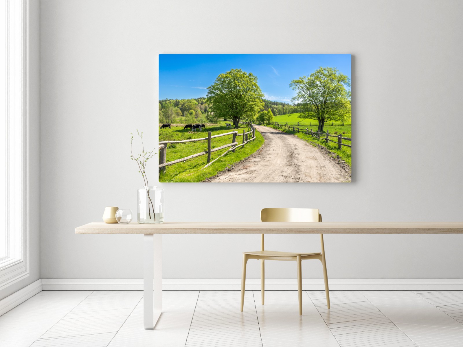 Friedliche ländliche Szene mit einem gewundenen Feldweg, leuchtend grünen Wiesen und klarem blauem Himmel, ideal zur Gestaltung von Räumen im rustikalen Stil.