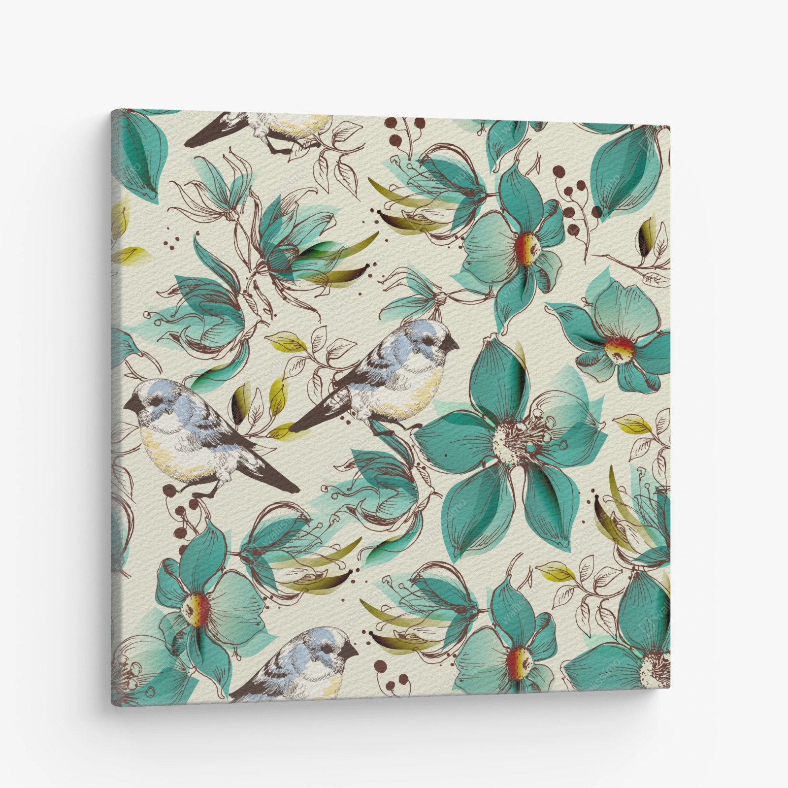 Leinwandbild Retro türkis blumen- und vogelmuster