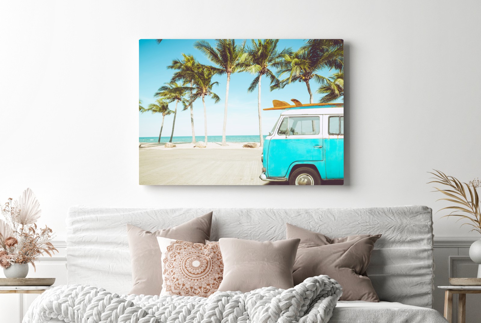 Sonnenverwöhntes Retro-Motiv mit einem Vintage-Bus und Surfbrett vor Palmen, perfekt um jedem Raum maritimen Charme zu verleihen.