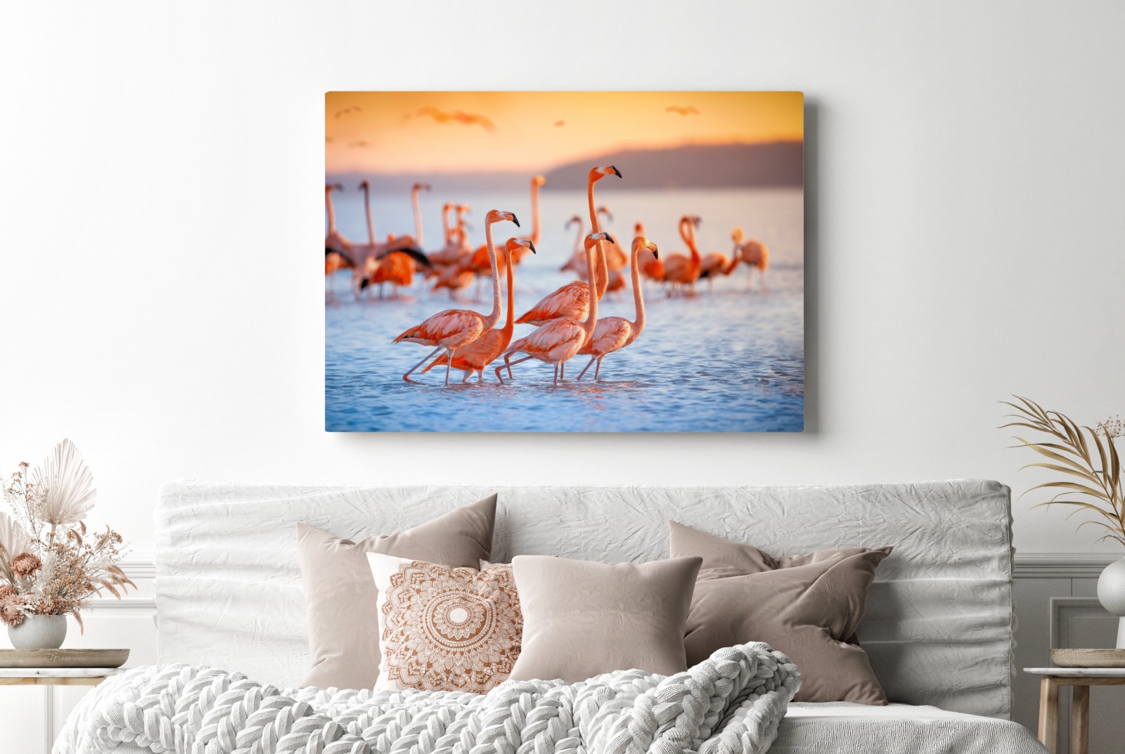 Lebendige Szene rosa Flamingos, die bei Sonnenuntergang im flachen Wasser waten und jedem Raum tropische Wärme und natürliche Eleganz verleihen.