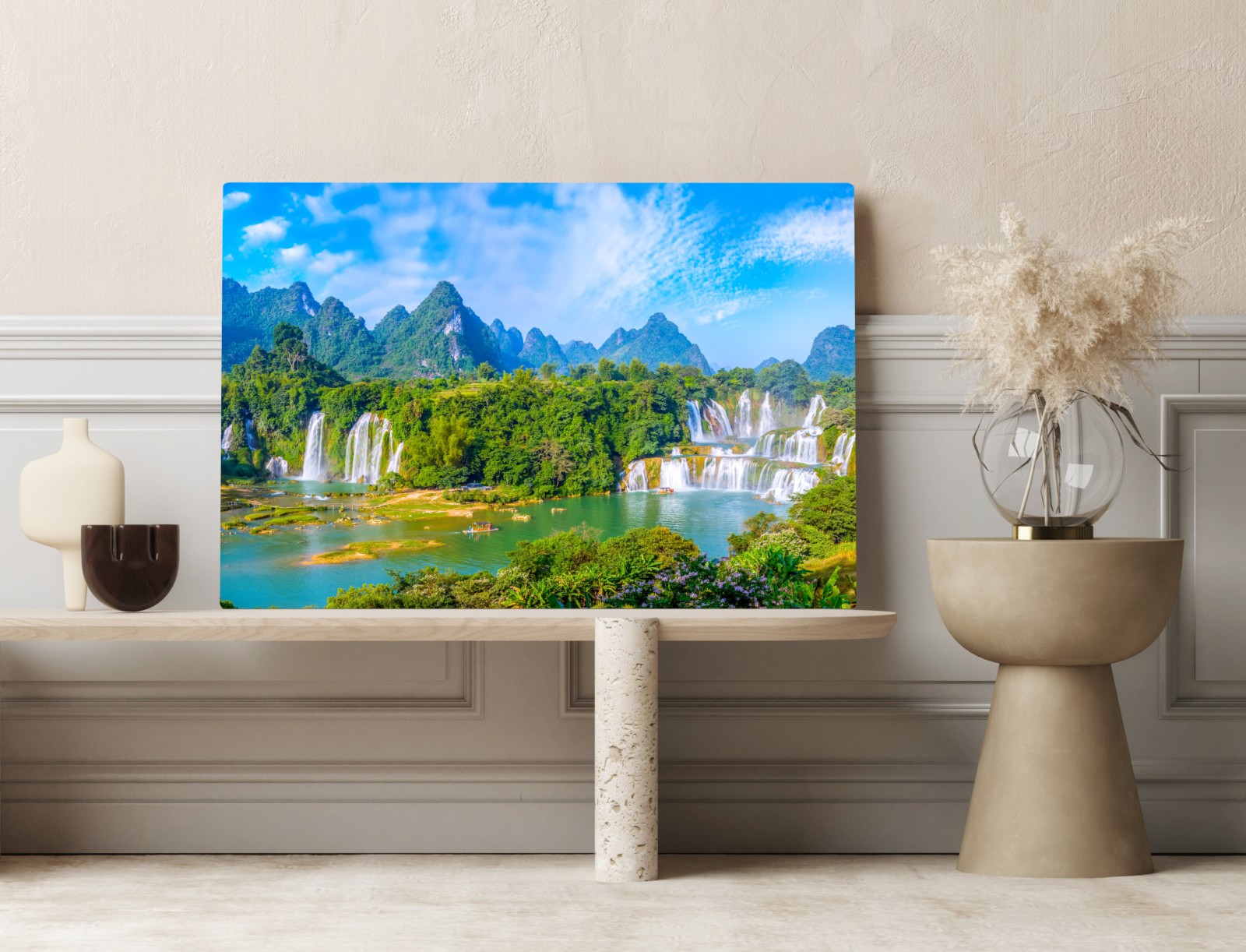 Bringen Sie beruhigende Energie in Ihren Raum mit dieser lebendigen Panoramaansicht von stürzenden Wasserfällen, smaragdgrünen Wäldern und dramatischen Karstgipfeln unter klarem blauem Himmel.