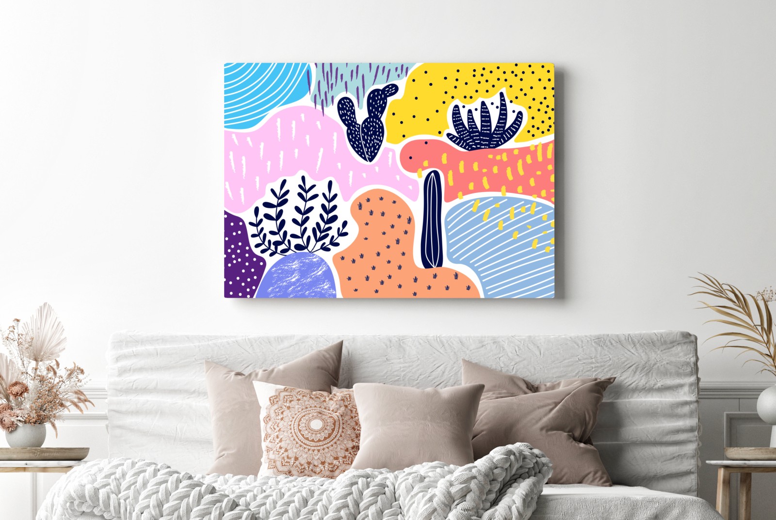 Helles und verspieltes abstraktes Motiv mit organischen Formen und botanischen Elementen, perfekt, um modernen Farbkontrast in jeden Raum zu bringen.