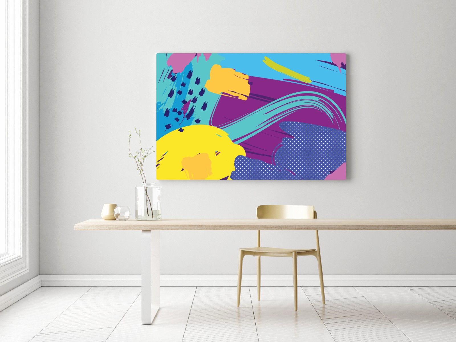 Kräftige Farben und verspielte Formen schaffen ein energetisches abstraktes Design, das jede Wand belebt und modernen Räumen Charakter verleiht.