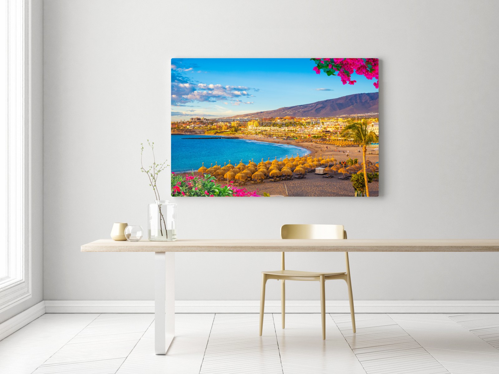 Heller Meeresblick auf den Strand von Torviscas auf Teneriffa mit türkisblauem Wasser, goldenen Sonnenschirmen und bunten Blumen, der Urlaubsatmosphäre in Ihr Zuhause bringt.