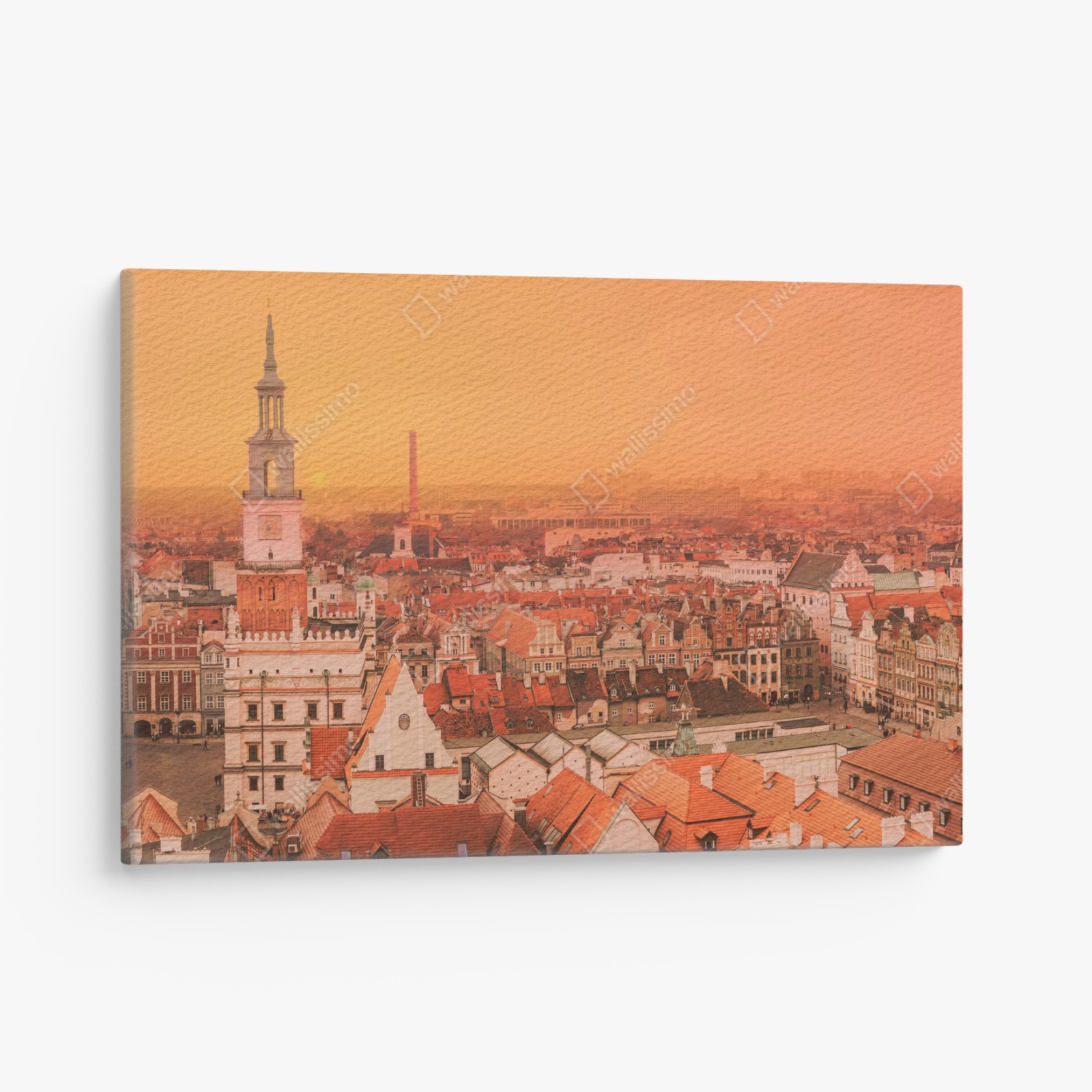 Leinwandbild warmer sonnenuntergang über historischen stadtdächern