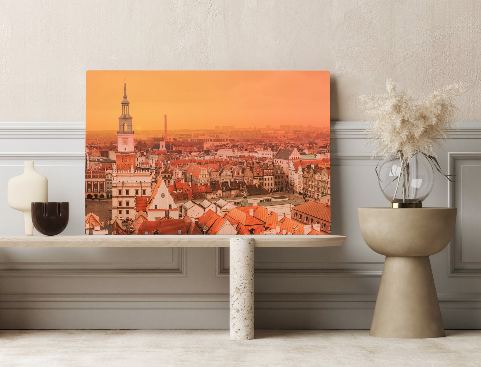 Warmer Panoramablick auf historische Stadtdächer bei Sonnenuntergang, perfekt um Innenräume mit Vintage-Charme zu bereichern.