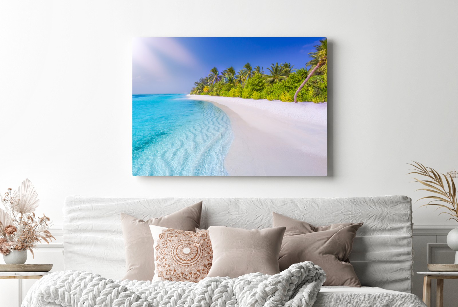 Bringen Sie tropische Ruhe in Ihr Zuhause mit diesem lebendigen Foto von türkisfarbenem Wasser, weißem Sand und wiegenden Palmen.