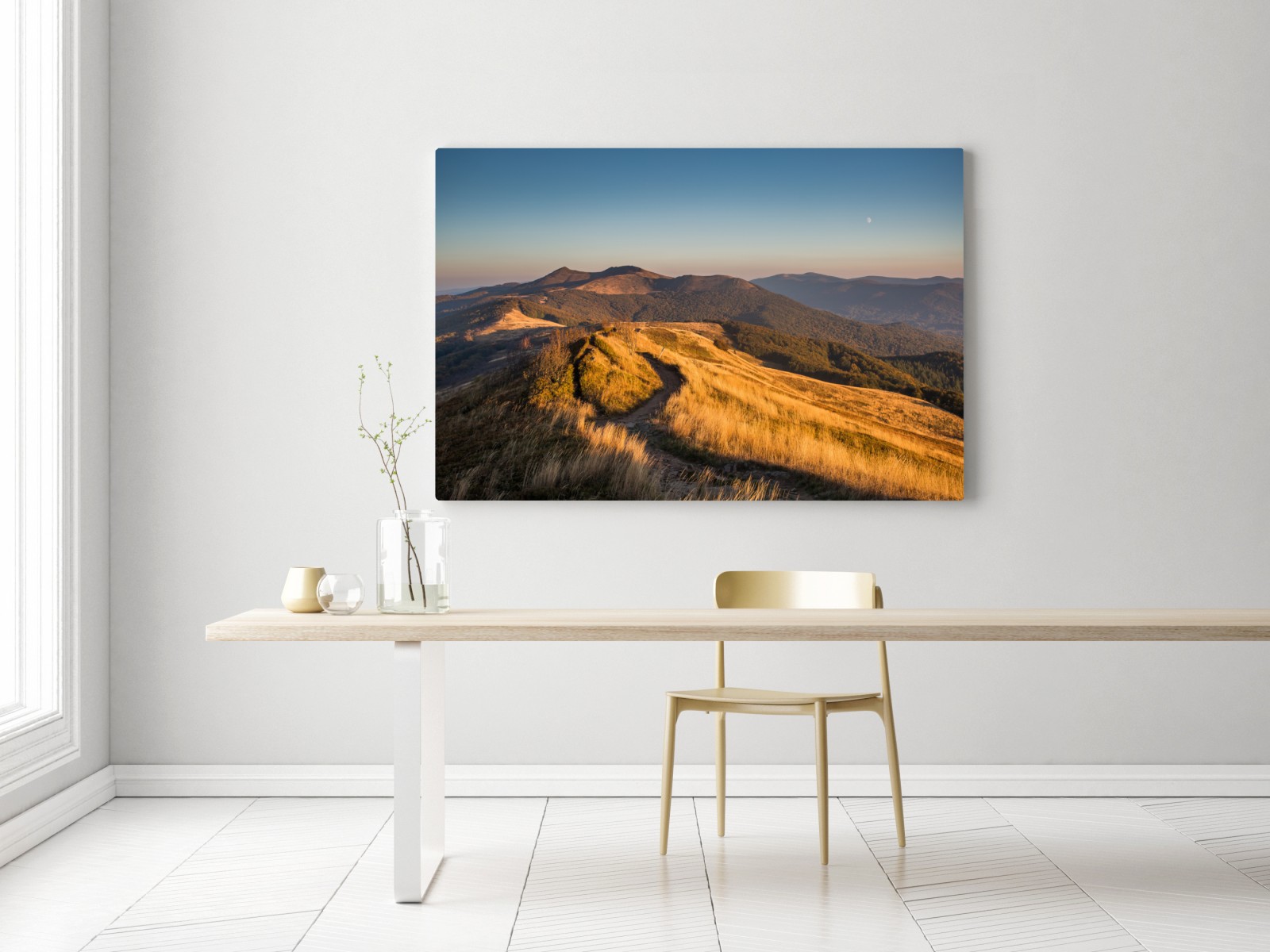 Ein ruhiger Bergrücken im goldenen Licht, ideal um natürliche Atmosphäre und Ruhe in den Raum zu bringen.