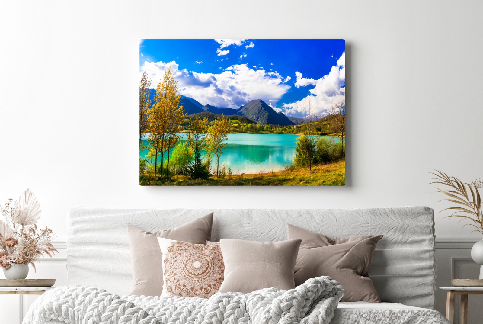 lebendiger türkissee eingerahmt von goldenen bäumen und dramatischen bergen, ideal um natürliche ruhe in ihr zuhause zu bringen.