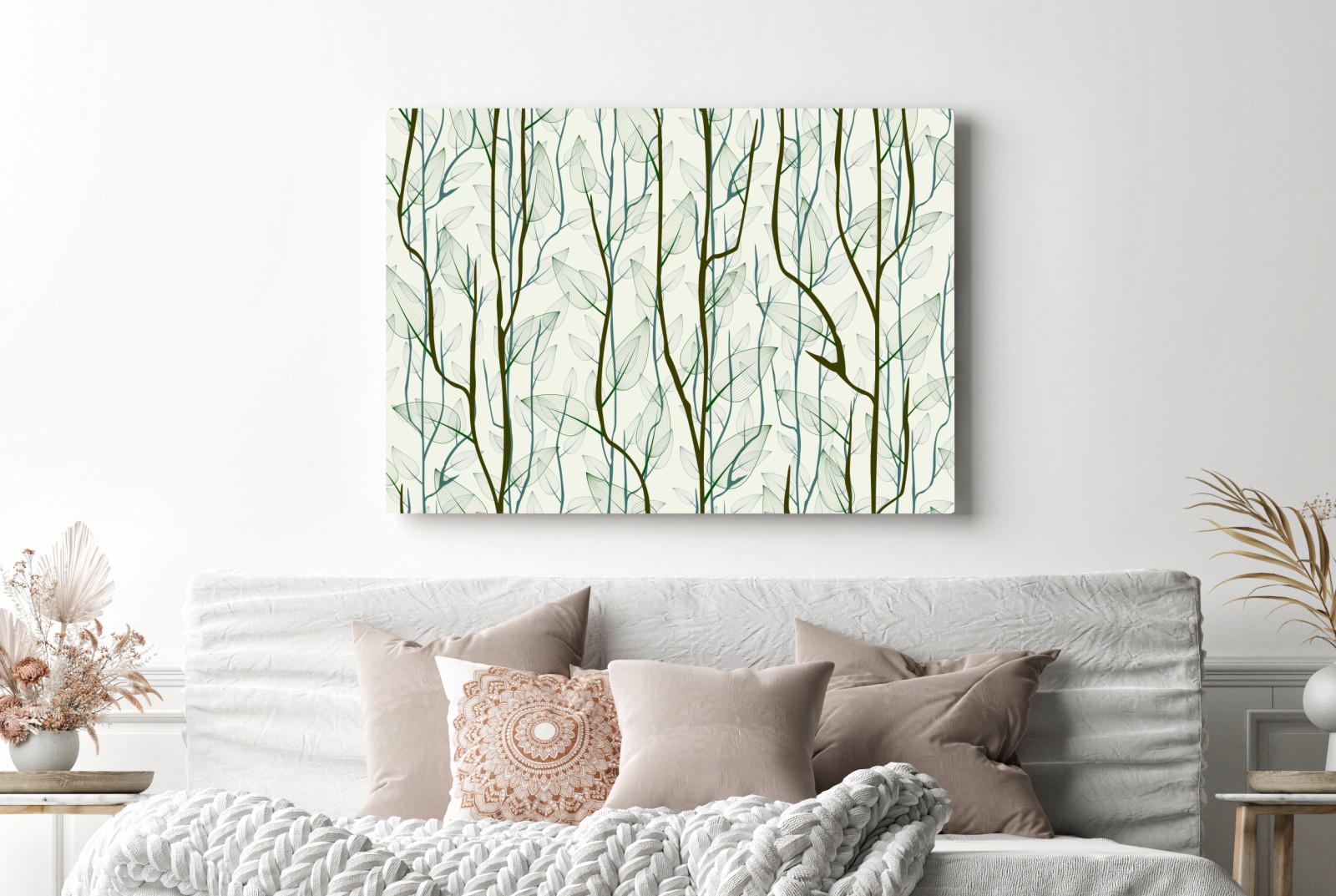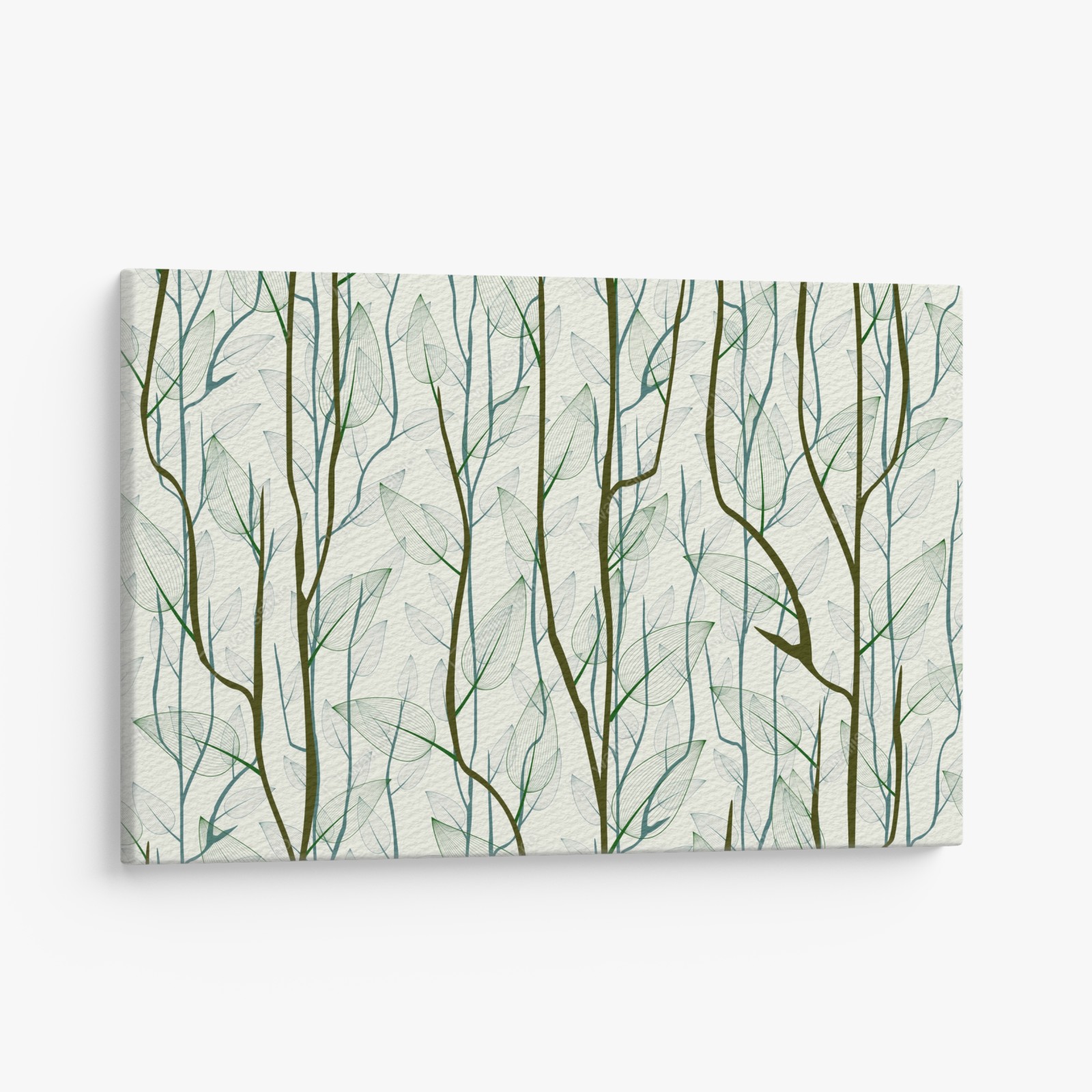 Beruhigendes botanisches Muster mit zarten grünen Zweigen und transparenten Blättern, ideal für eine naturinspirierte Einrichtung.