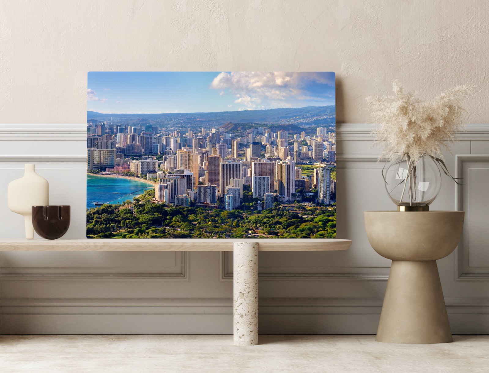 Lebendiger Panoramablick auf eine tropische Küstenstadt mit türkisblauem Wasser, Sandstränden und hohen Wolkenkratzern – perfekt, um Räumen urbanes Flair zu verleihen.