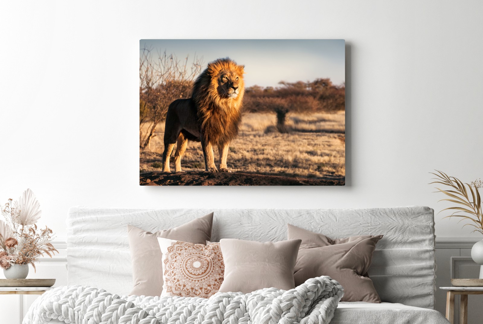 Ein eindrucksvolles Porträt eines majestätischen Löwen, der stolz auf einem Hügel steht und jedem Raum wilde Erhabenheit und Wärme verleiht.