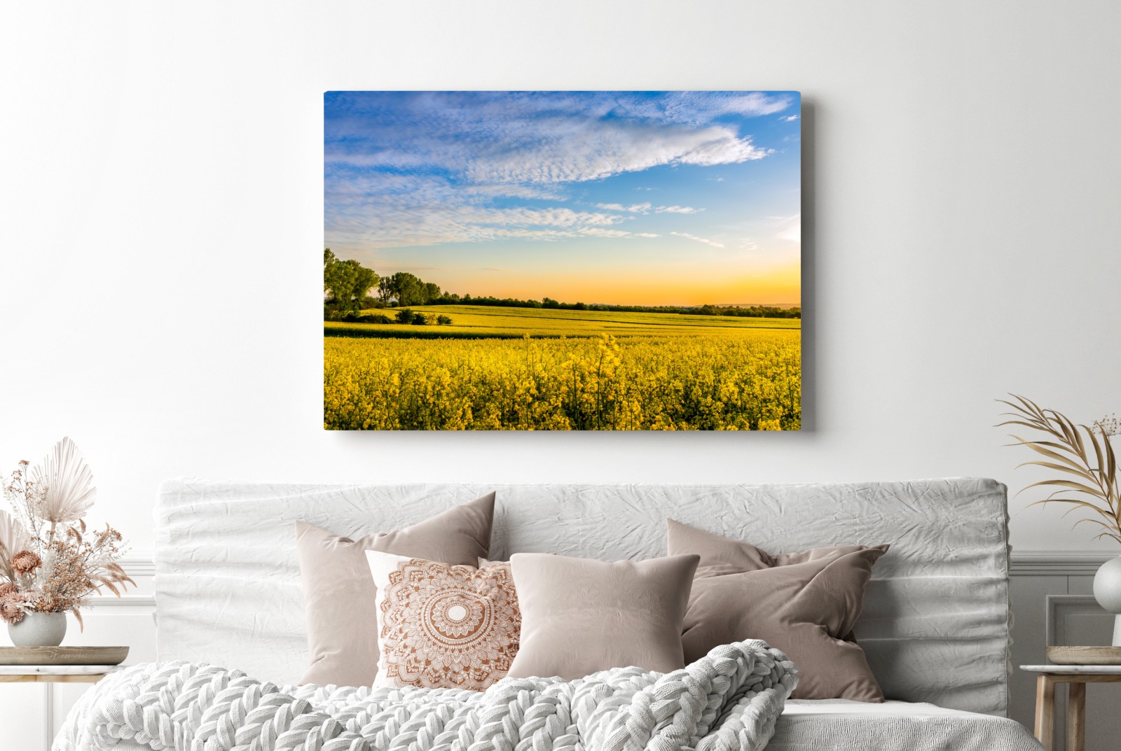 Ein leuchtendes Rapsfeld erstreckt sich bis zum Horizont unter klarem blauem Himmel und bringt warme, natürliche Atmosphäre in jeden Raum.