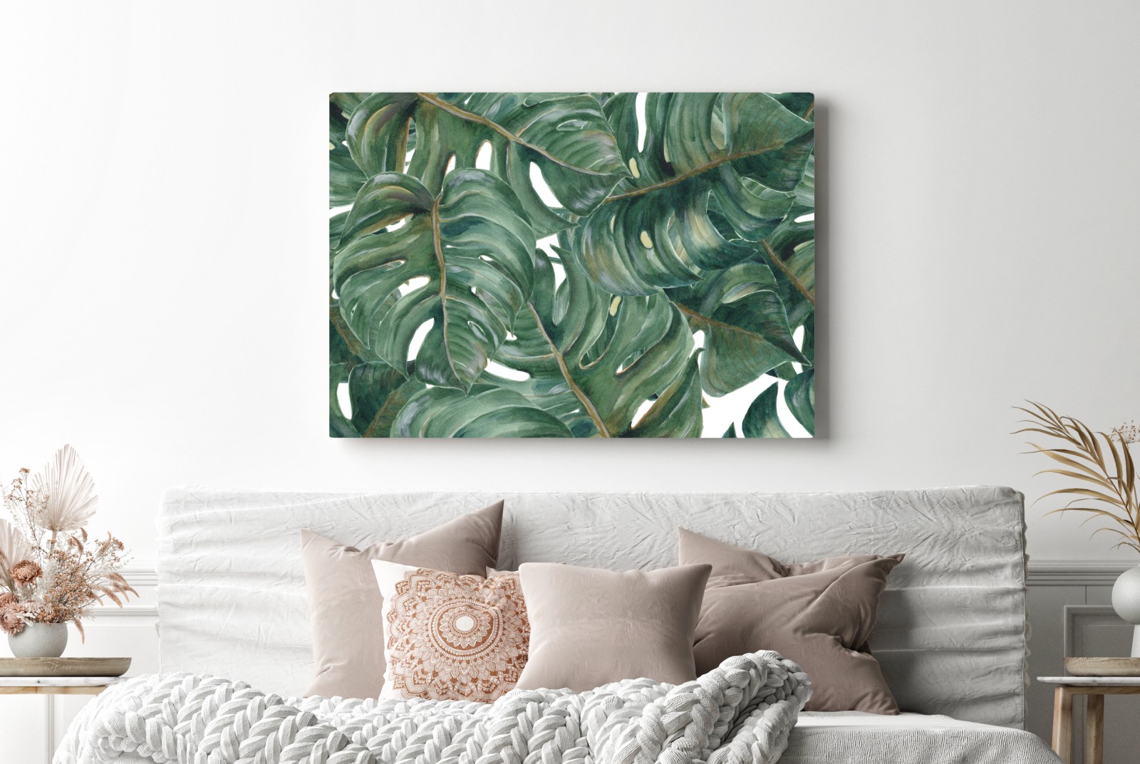bringen sie tropisches flair in ihr zuhause mit aquarellierten monstera-blättern, perfekt um natürlichen charakter und grün in jeden raum zu bringen.