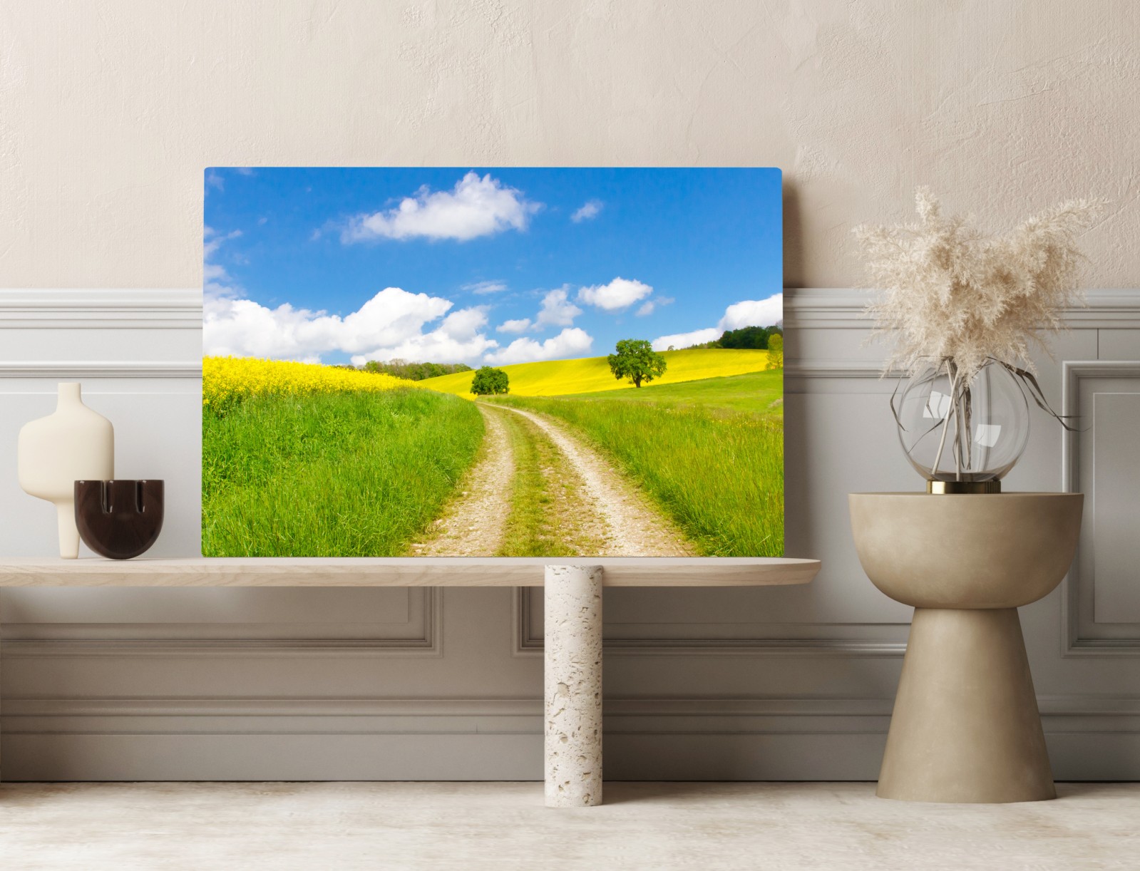 Helle ländliche Landschaft mit einem Feldweg durch grüne Wiesen und goldene Rapsfelder unter klarem blauem Himmel — perfekt, um die Natur ins Zuhause zu holen.