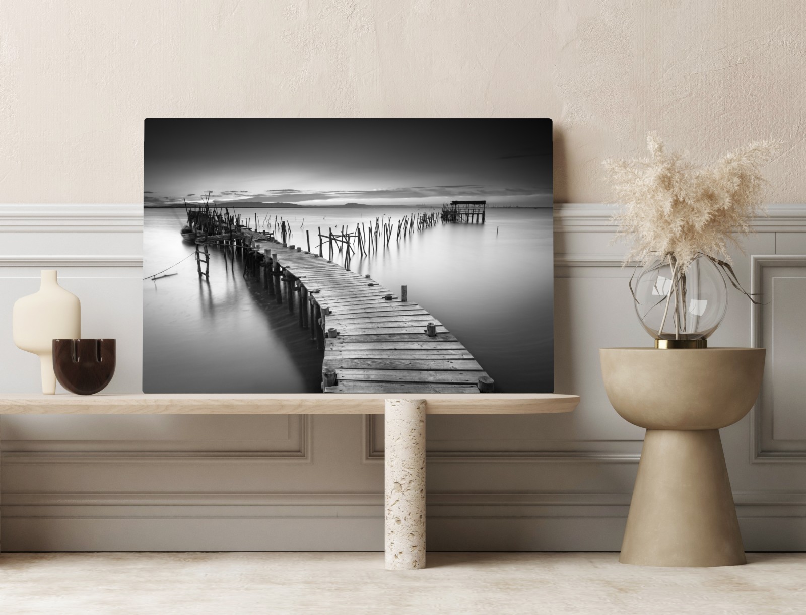 Minimalistische monochrome landschaft mit einem hölzernen steg über ruhigem wasser, die einen eleganten und reduzierten akzent im interieur setzt.