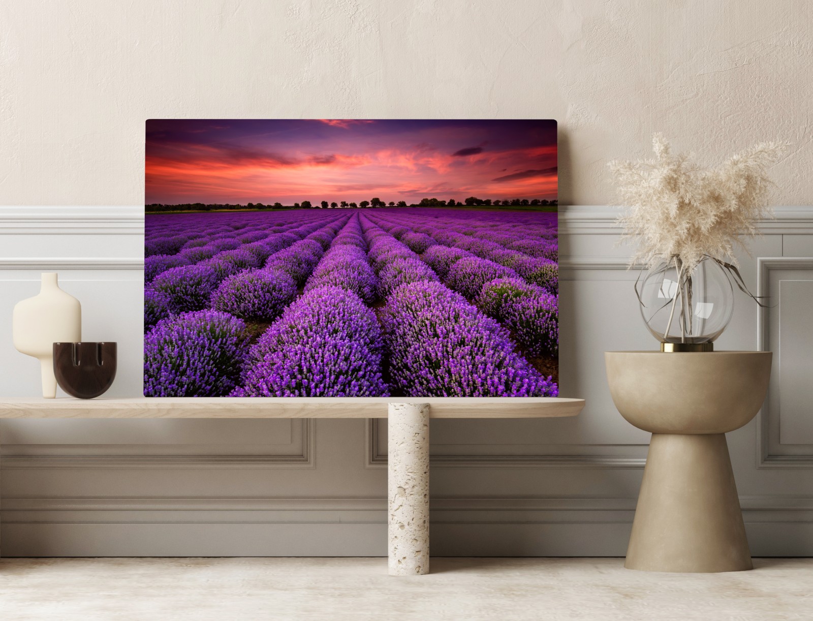 Beruhigende panoramaaufnahme blühender lavendelreihen unter einem dramatischen sonnenuntergang, ideal um natürliche atmosphäre ins zuhause zu bringen.