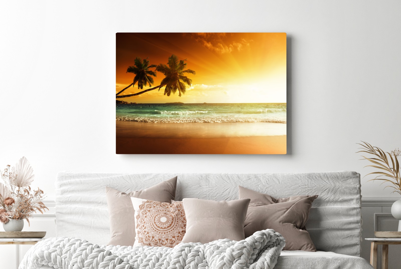 Bringen Sie warme Inselstimmung mit diesem goldenen Sonnenuntergang über einem tropischen Strand in Ihr Zuhause, mit Palmensilhouetten und sanften Wellen.