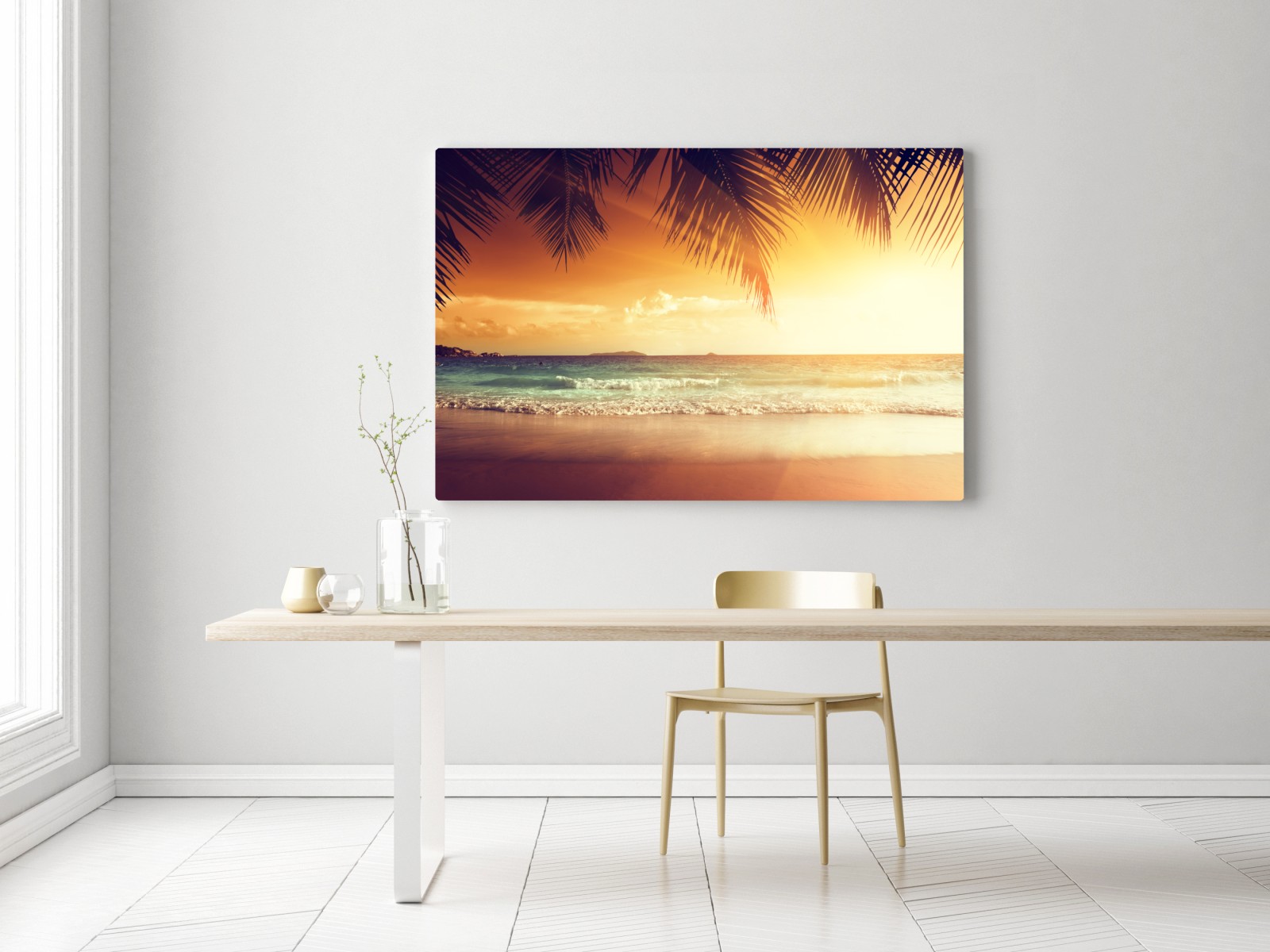 Warmer Sonnenuntergang über einem ruhigen Strand mit Palmen, bringt tropische Ruhe und Atmosphäre in jeden Raum.