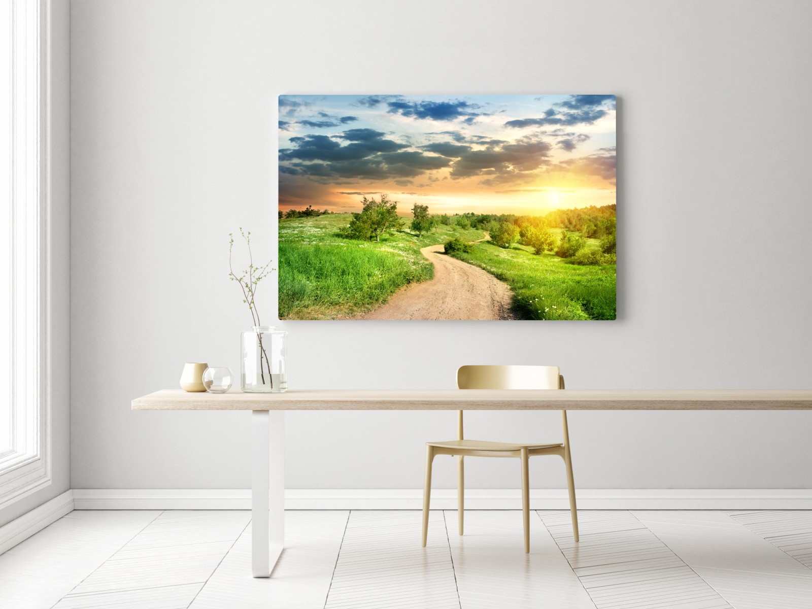 Ruhiger Sonnenuntergang über einem gewundenen Feldweg durch üppige Frühlingswiesen, perfekt um Natur ins Zuhause zu holen.