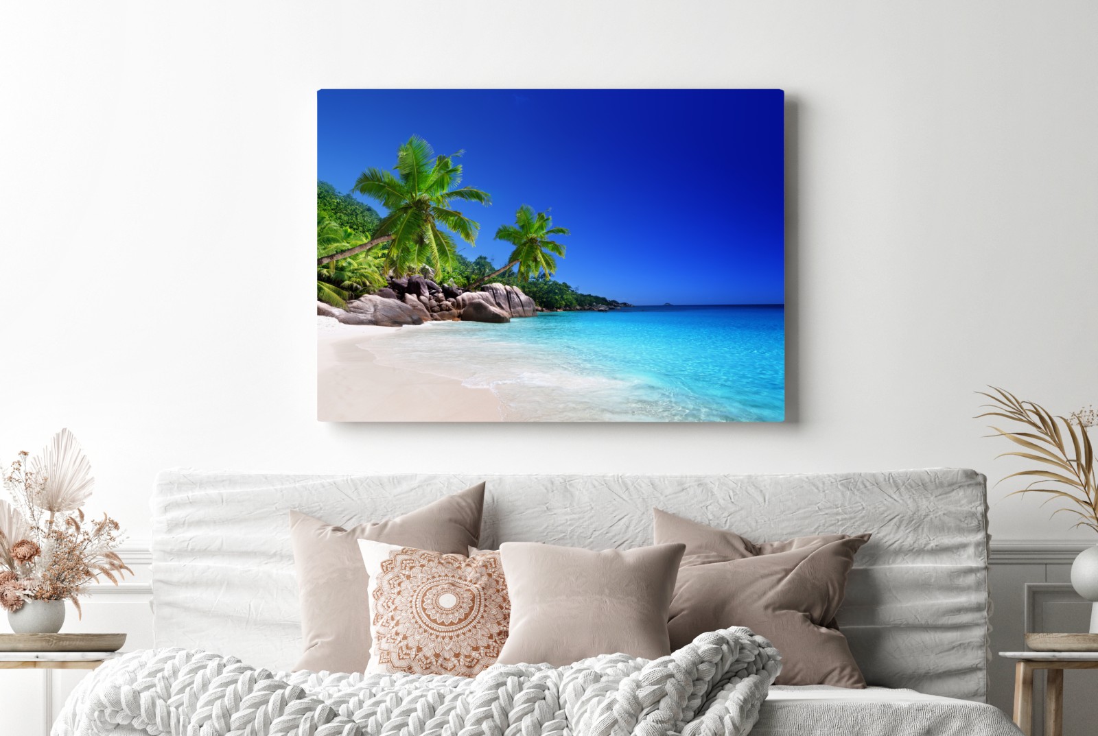 Bringen Sie die beruhigende Stimmung eines tropischen Strandes in Ihr Zuhause mit türkisfarbenem Wasser, wiegenden Palmen und feinem weißen Sand.