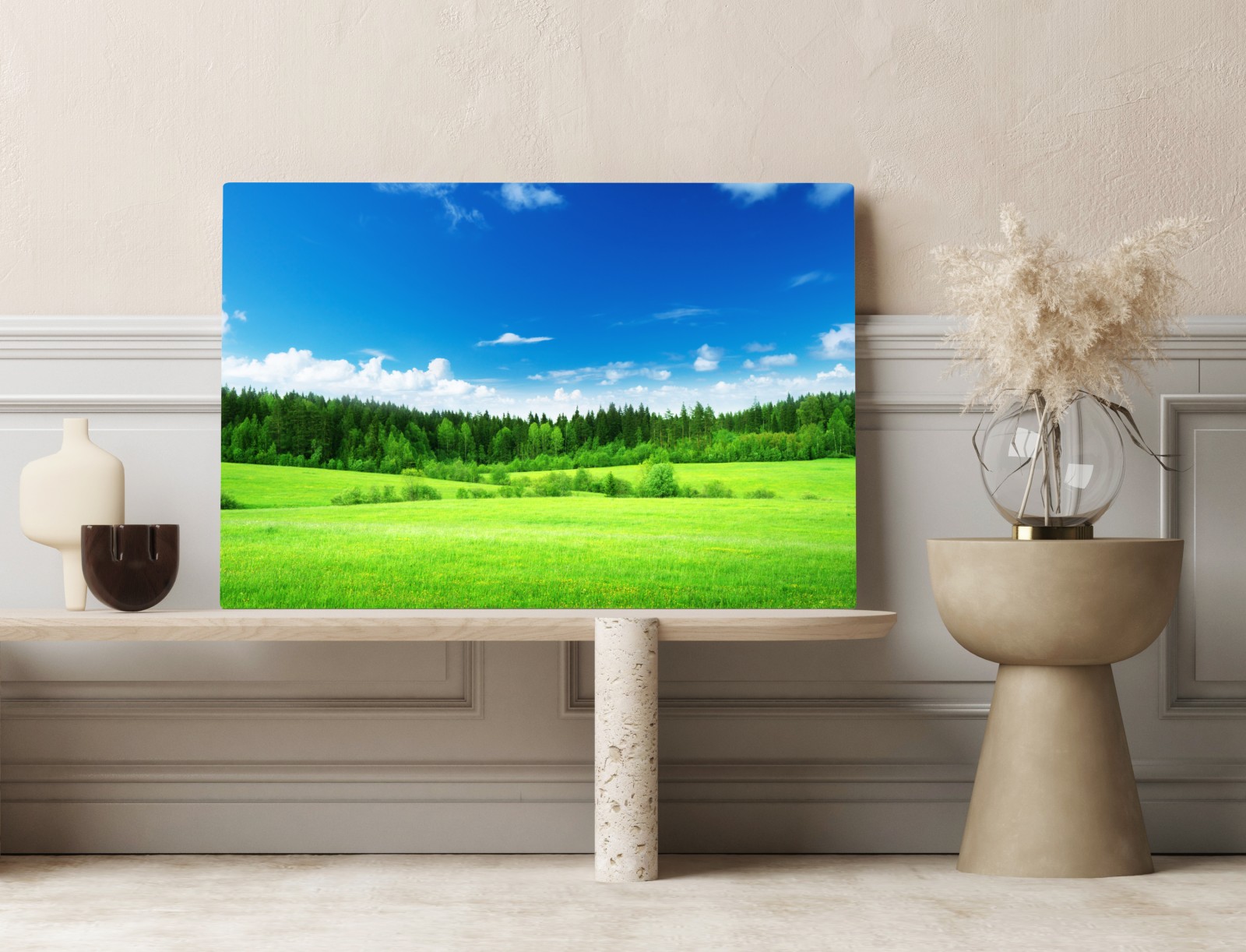 Bringen Sie die Ruhe einer Frühlingswiese in Ihr Zuhause mit diesem lebendigen Landschaftsbild aus saftigen Feldern, dichtem Wald und klarem Himmel.