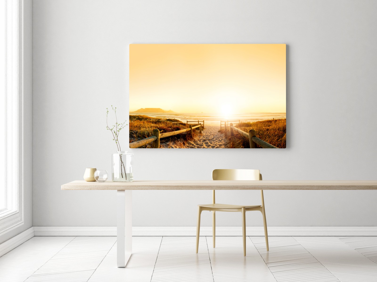 Warmes goldenes Licht taucht den sandigen Weg zum Meer mit Blick auf den Tafelberg in eine ruhige Panoramaansicht, ideal für jeden Wohnraum.