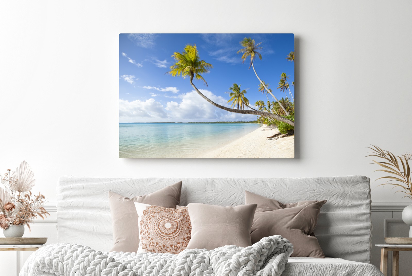 Entdecken Sie einen tropischen Strand mit türkisblauem Wasser und wiegenden Palmen, perfekt um eine ruhige Küstenatmosphäre in Ihr Zuhause zu bringen.
