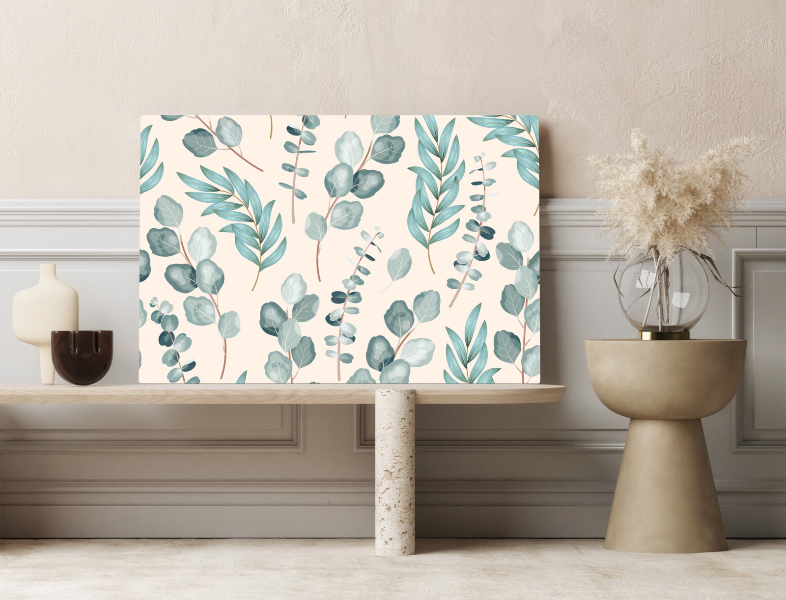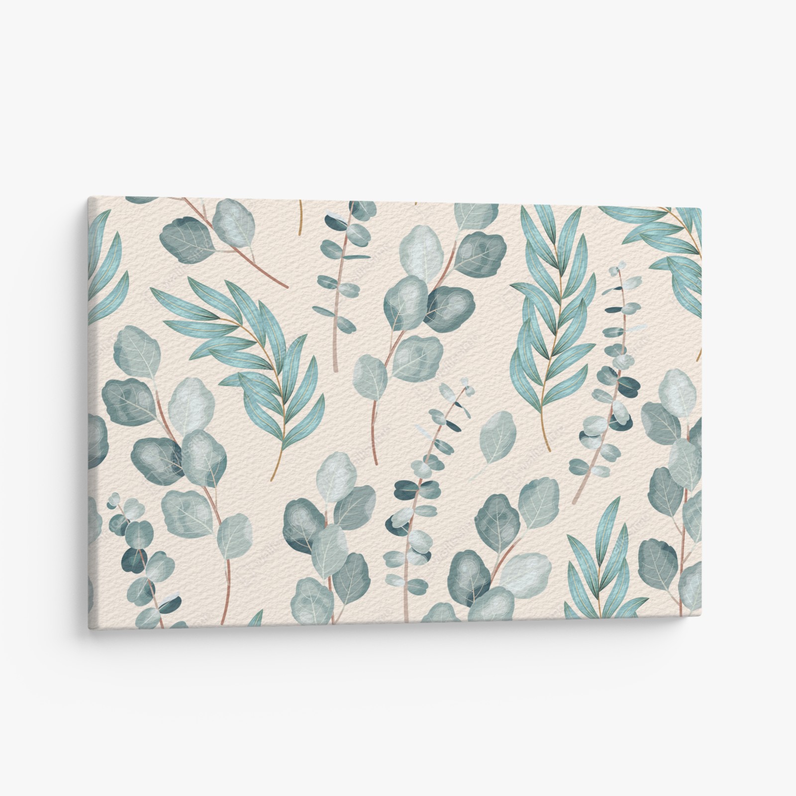 Sanfte pastellfarbene Eukalyptusblätter schaffen ein beruhigendes botanisches Muster, das jedem Raum natürliche Eleganz verleiht.