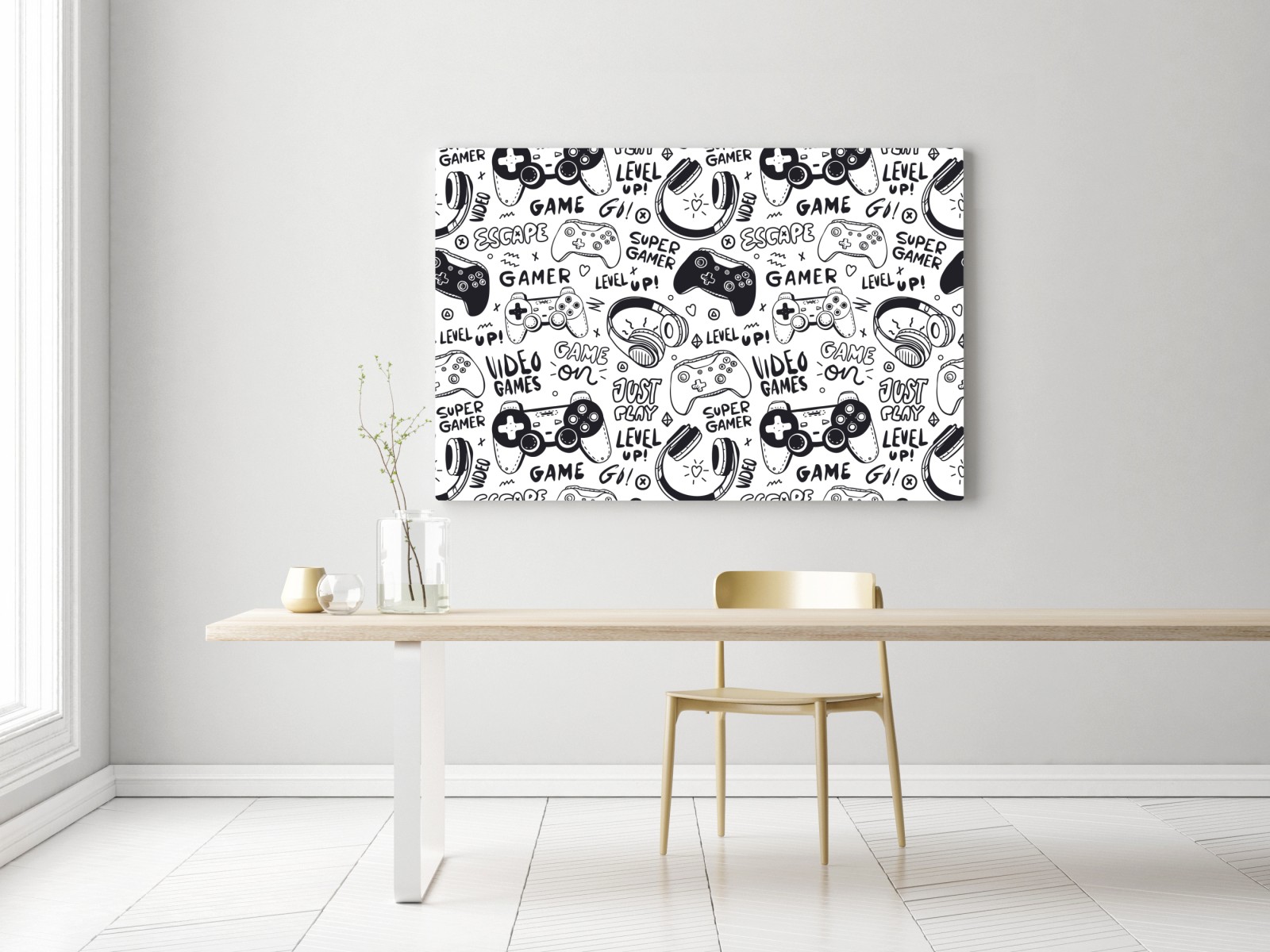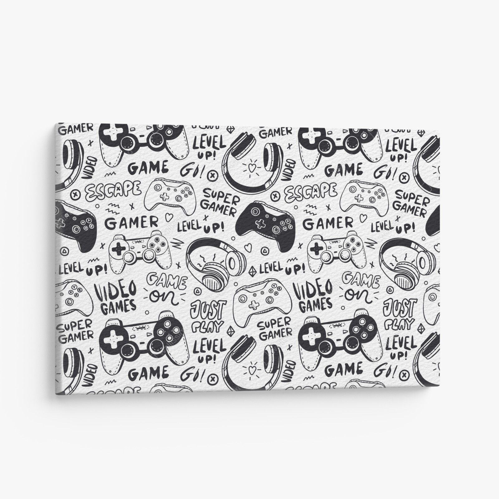 Kraftvolles schwarz-weißes Doodle-Muster mit Controllern und Kopfhörern, ideal für Spielzimmer und moderne Wohnakzente.