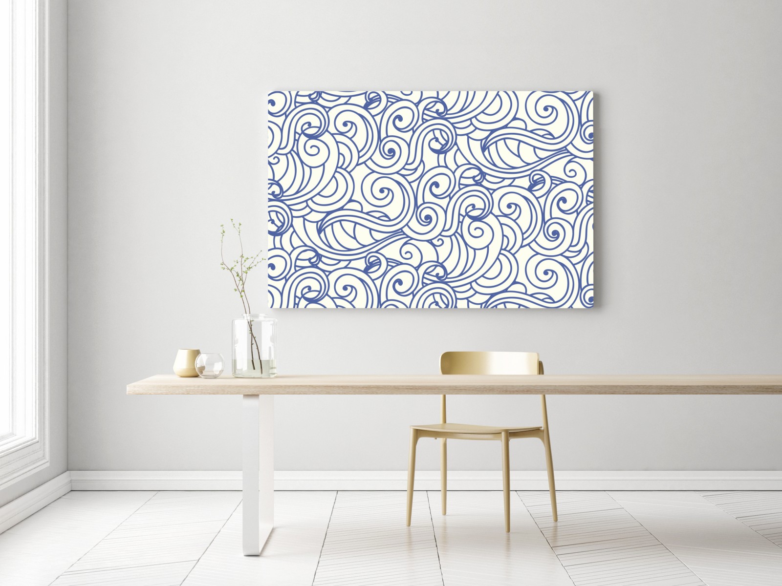 Elegantes nahtloses blaues Wirbelmuster, das eine ruhige, moderne Atmosphäre ins Interieur bringt und sich hervorragend als Wandbild oder Stoffdruck eignet.