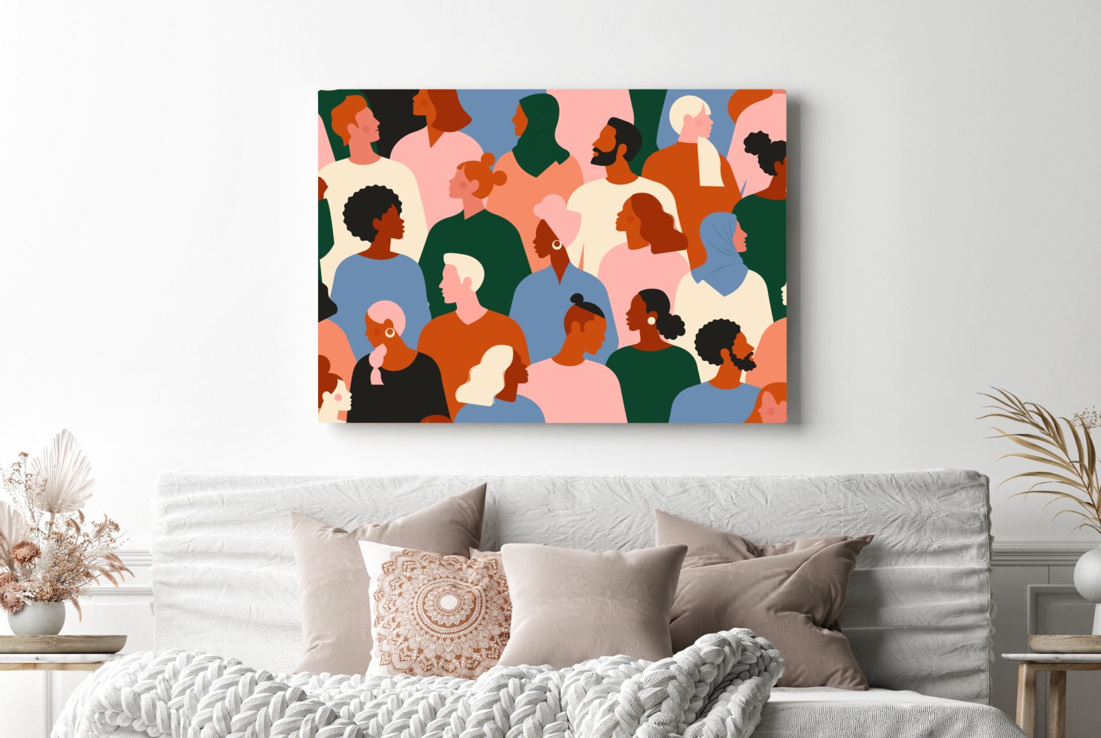Lebendige flache Illustration, die Vielfalt und Einheit durch stilisierte Porträts in warmen, modernen Farben feiert und Innenräumen frischen Charakter verleiht.