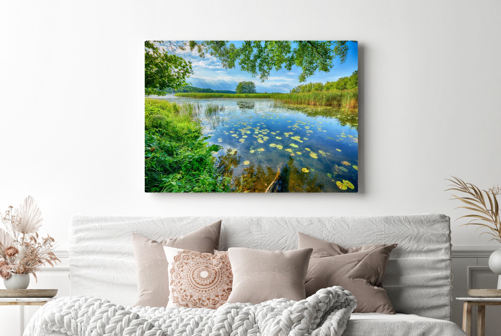 Lebhafte Sommeraufnahme aus Masuren in Polen mit ruhigem Wasser, Seerosen und üppigem Grün, ideal um Räume mit Gelassenheit zu füllen.