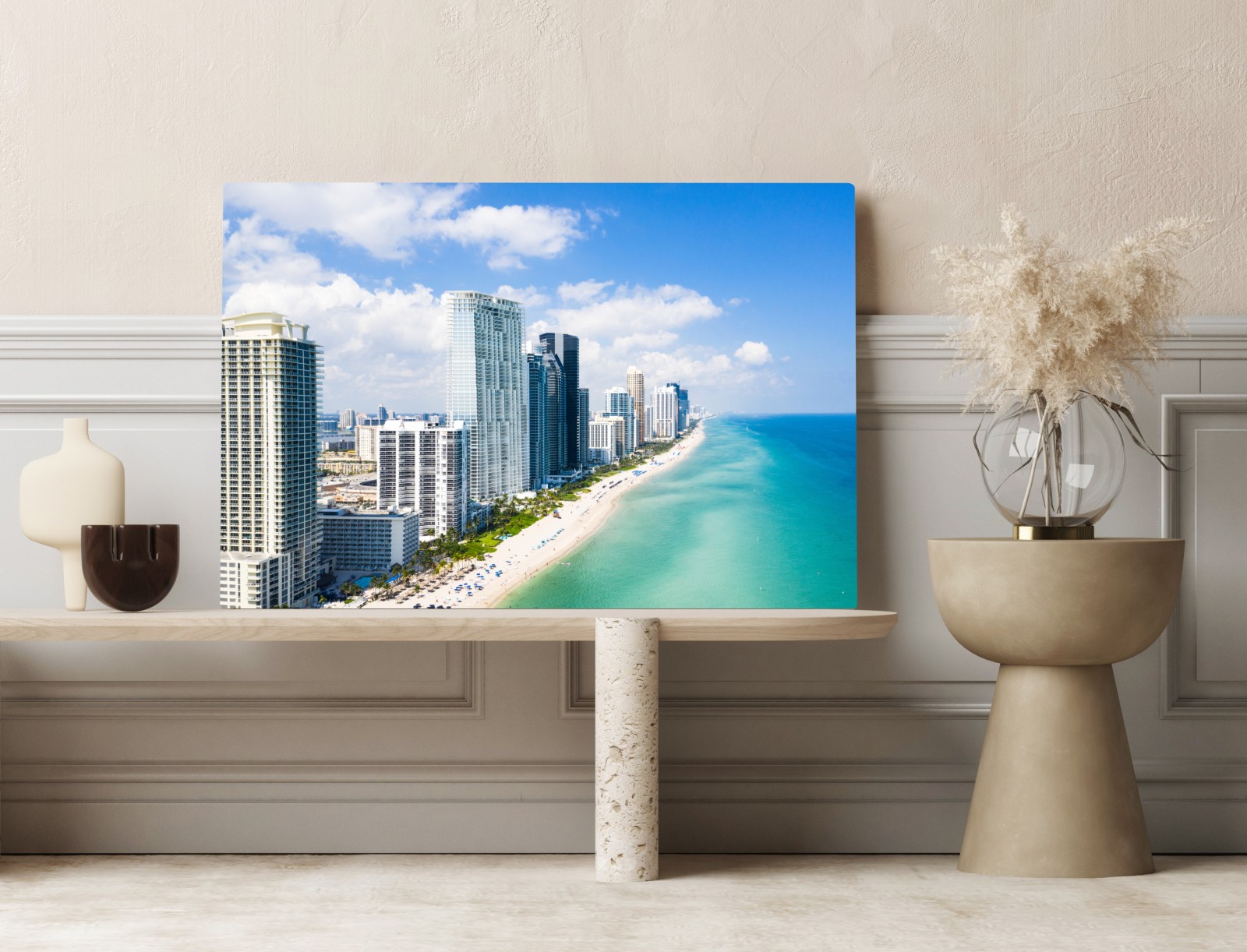 Helle Luftaufnahme einer Küstenstadt mit türkisfarbenem Wasser und modernen Wolkenkratzern, ideal um ein frisches, maritimes Flair ins Zuhause zu bringen.