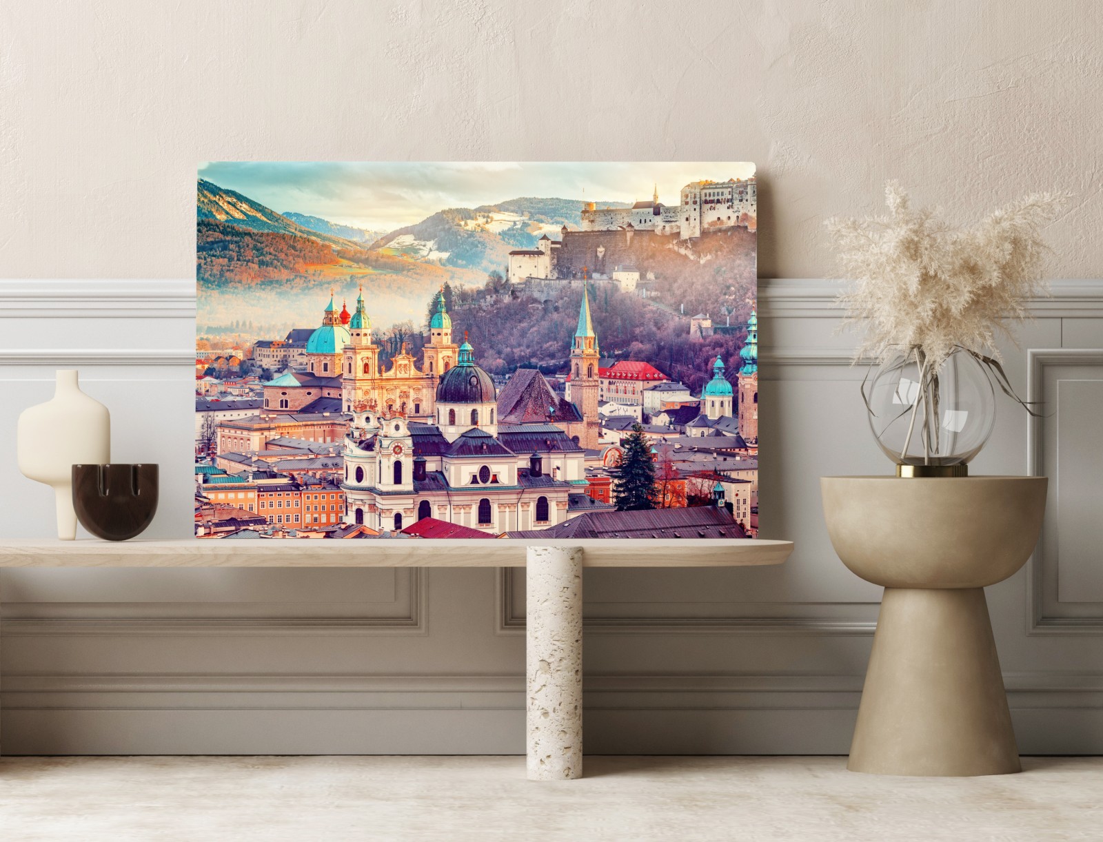 Leinwandbild sonnenuntergang über Salzburgs skyline – Wallnifity®