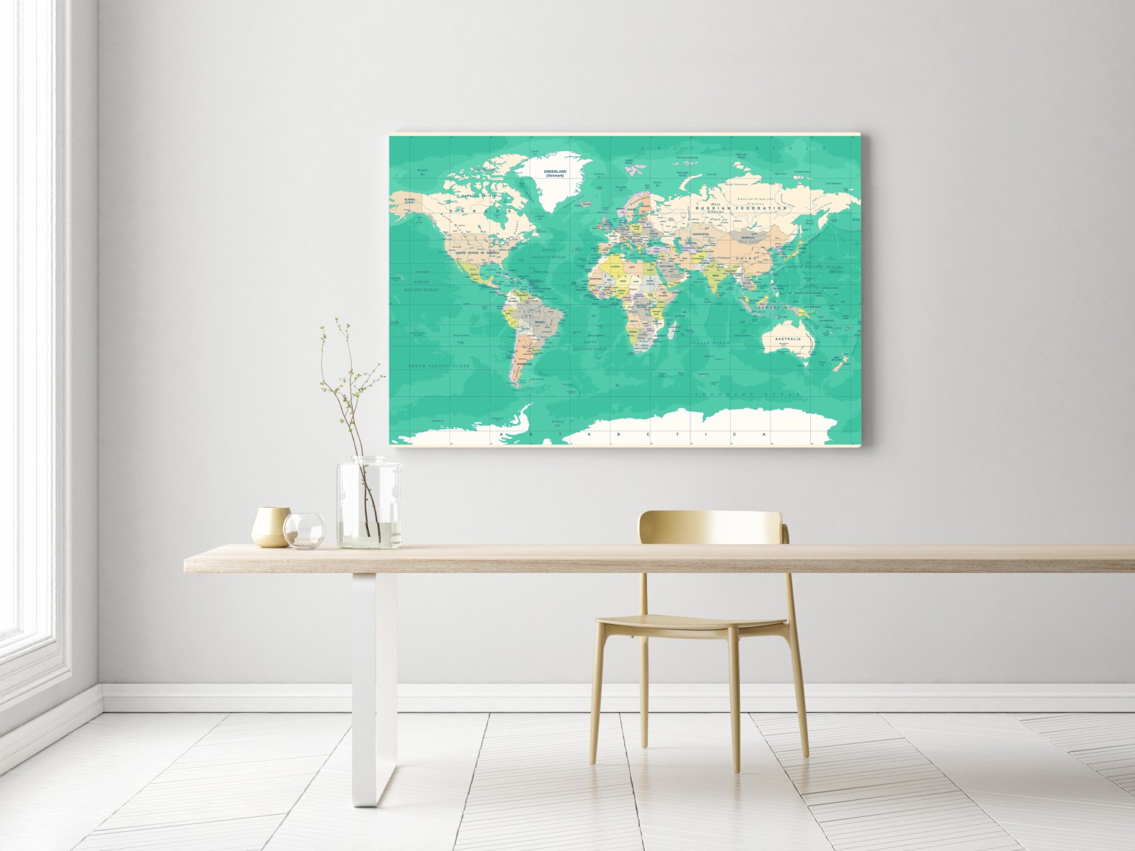 Stilvolle vintage-weltkarte mit sanften farben und klaren ländergrenzen, ideal für reiseliebhaber und als dekoratives element für zuhause oder büro.