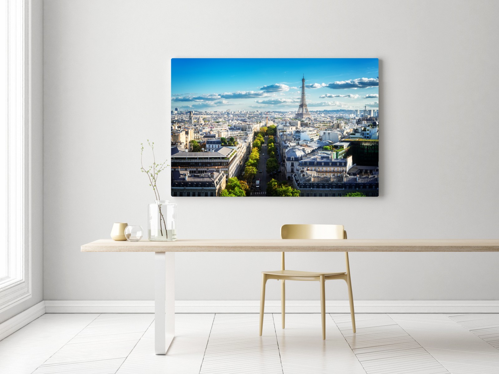 Beeindruckende Panoramaaufnahme von Paris mit dem Eiffelturm und sonnenbeschienenen Dächern, die urbanen Charme in jeden Raum bringt.