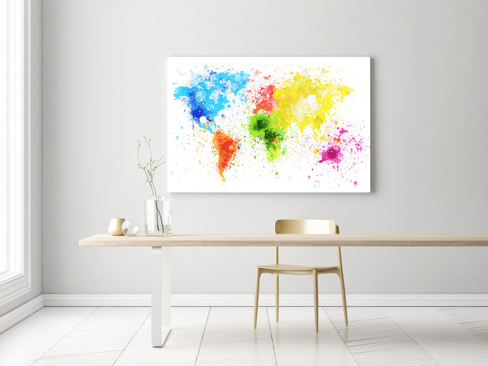 Lebendige Aquarell-Weltkarte mit bunten Farbspritzern, ideal als moderner Blickfang für Büro oder Wohnzimmer.
