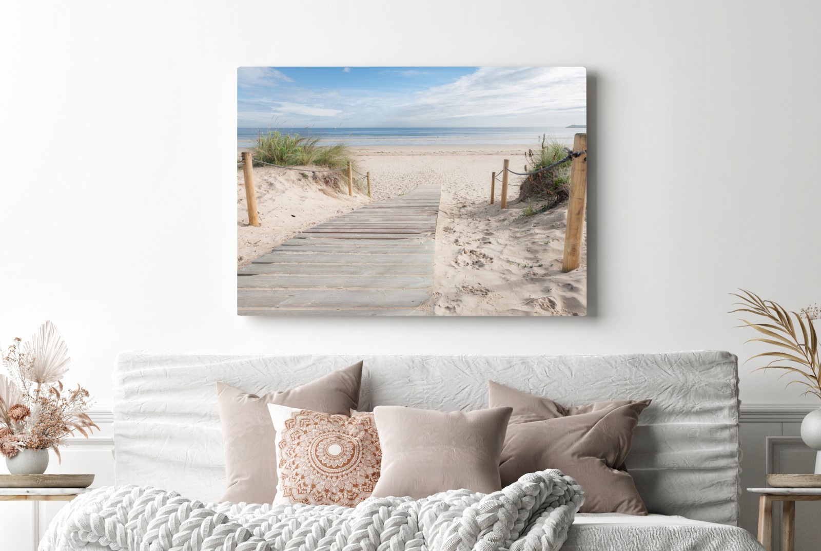 Bringen Sie beruhigendes Küstenflair in Ihre Räume mit diesem ruhigen Blick auf einen Steg zum Meer, perfekt für eine friedliche Atmosphäre.