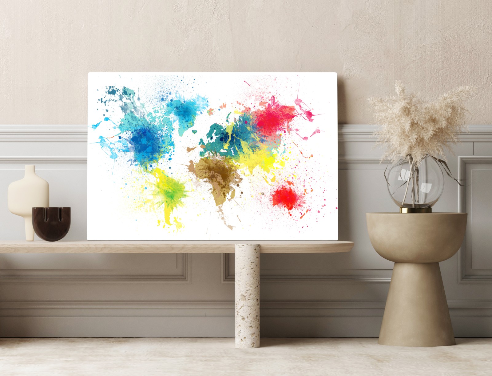 Lebhafte, bunte Weltkarte mit Farbspritzern, perfektes Wandbild für Reisebegeisterte und moderne Räume.