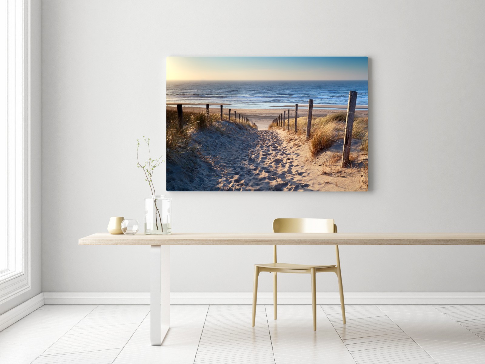 ein ruhiger sandweg durch dünen führt zur Nordsee im goldenen licht des sonnenuntergangs und bringt eine entspannte küstenatmosphäre in jeden raum.