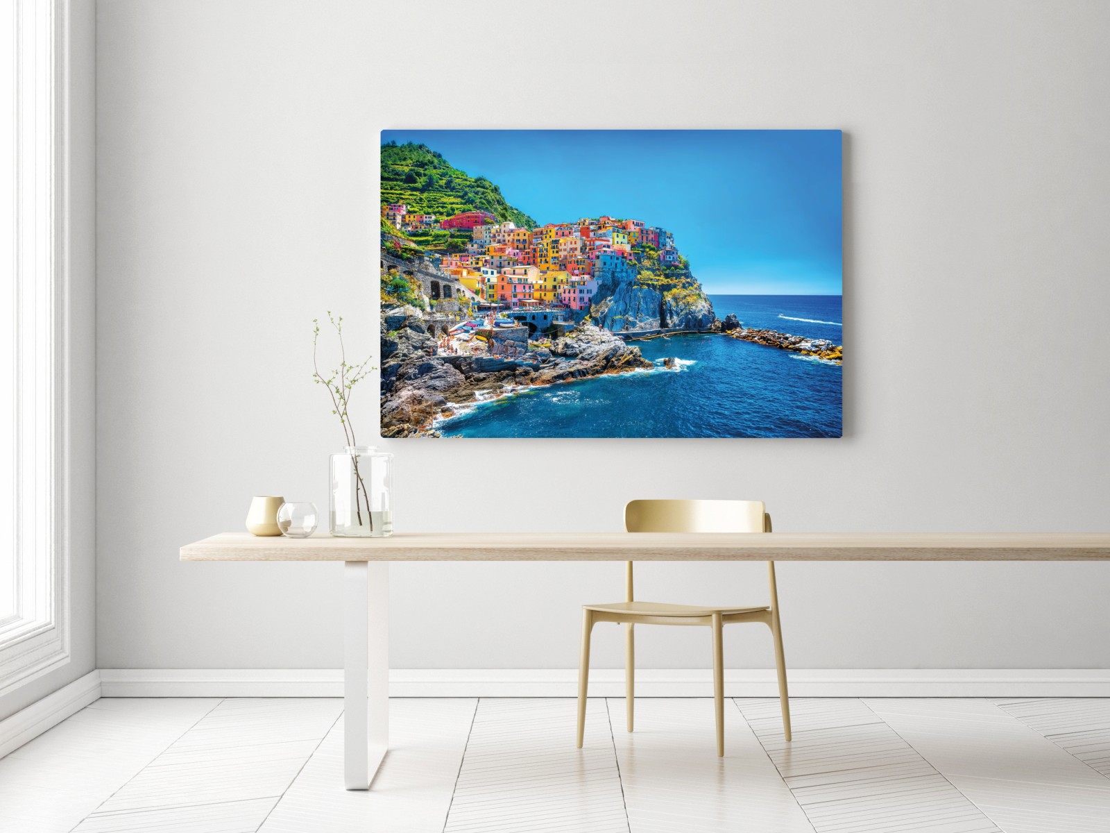 Bringen Sie maritimen, farbenfrohen Charme in Ihr Zuhause mit diesem lebendigen Foto eines bunten Dorfes auf den Klippen über dem tiefblauen Meer.