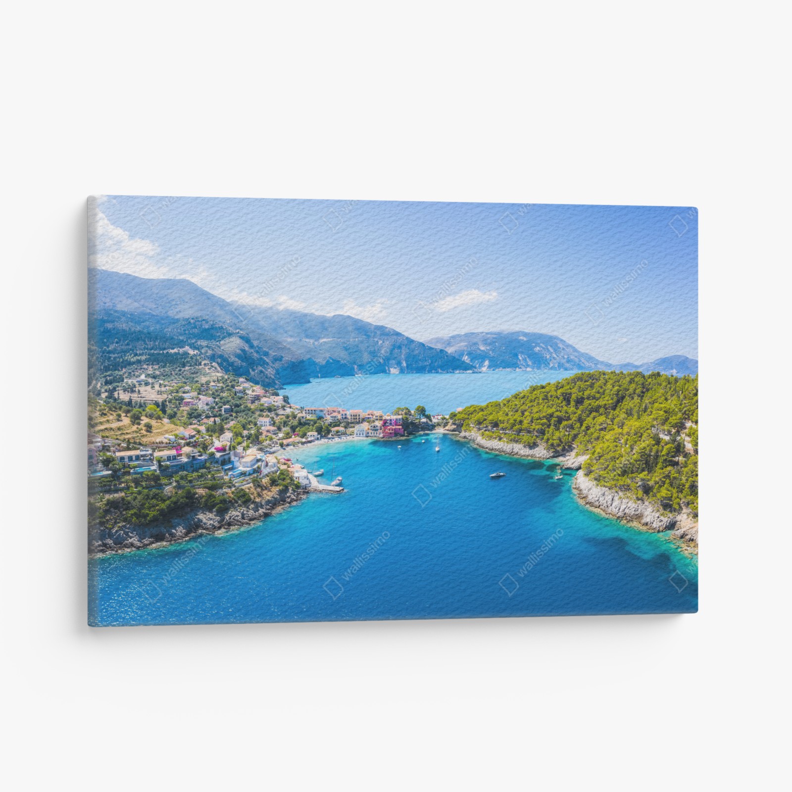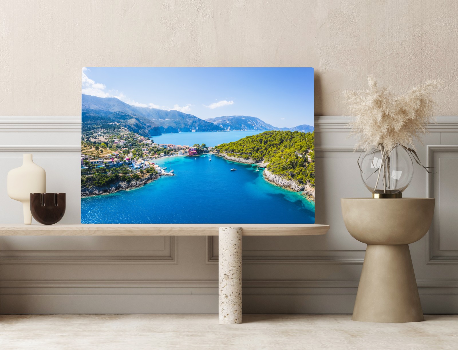 Lebendige Luftaufnahme einer sonnigen Bucht mit türkisfarbenem Wasser und charmantem Dorf, ideal, um sommerliche Ruhe in Ihr Zuhause zu bringen.